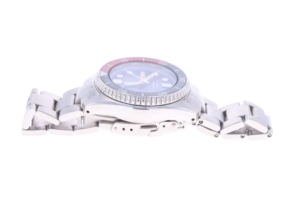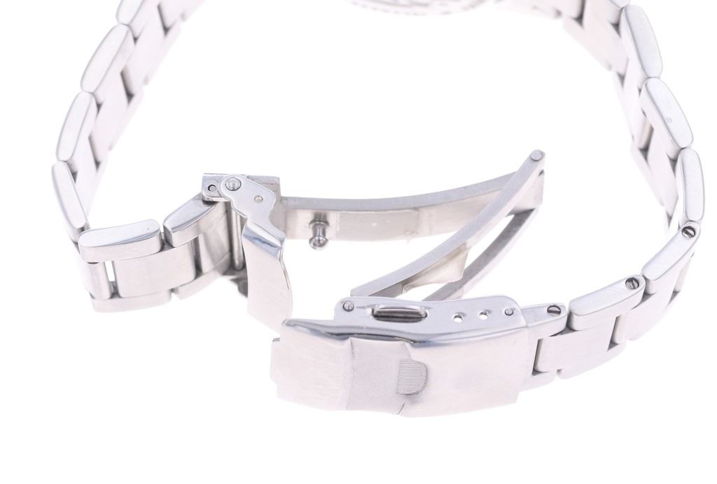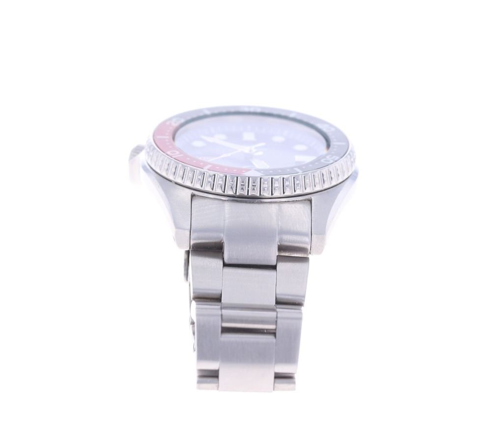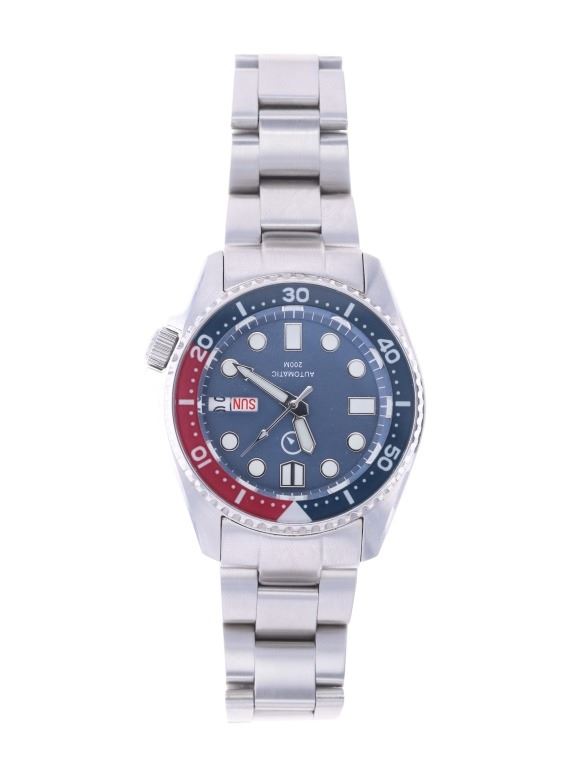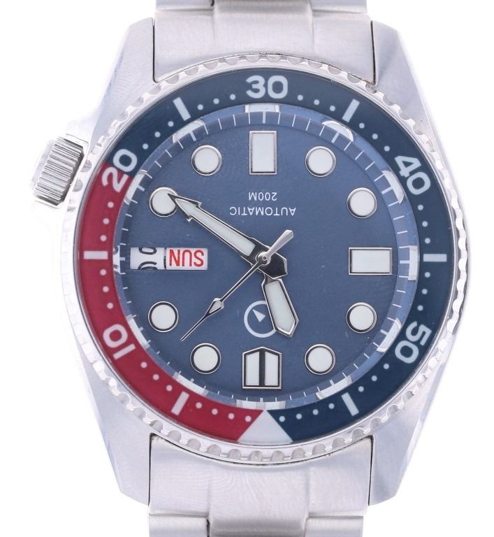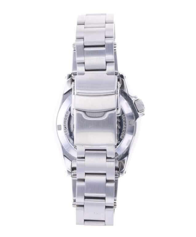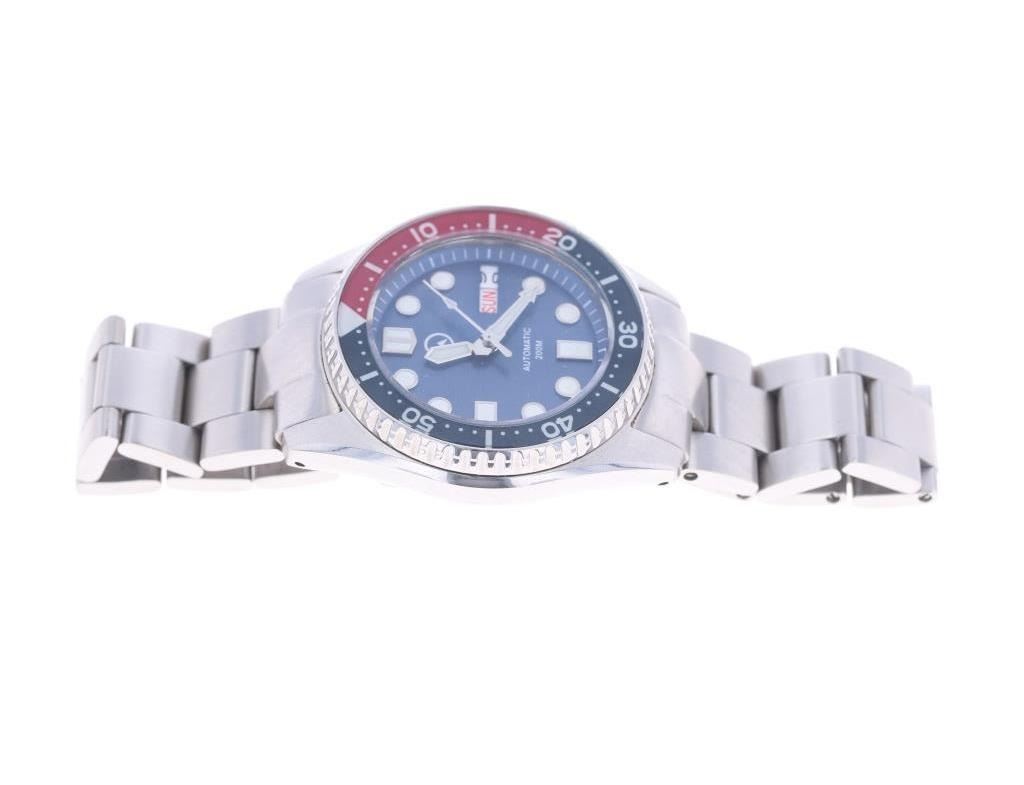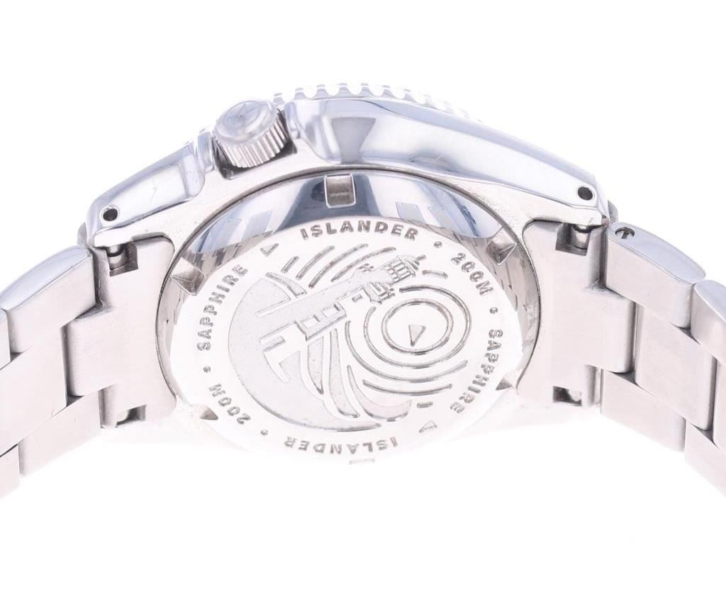 Featured in this lot is this Islander 38mm automatic dive watch with a solid-link bracelet, AR sapphire crystal and luminous sapphire bezel insert. Long Island Watch's primary brand is Islander. Islander, a watch company founded in 2019, offers a variety of watches in almost every category, including dive, field, dress, and everyday watches. The watches are made in the United States using designs and styles from Germany, Switzerland, Italy, the Islands, and the Far East. The case of the watch is 38 mm and features an offset screw-down crown at the 4:00 mark. The case back has a rendering of Long Island on it along with the Islander name, Island Watch, jewel setting and a 200 meter water resistance rating. An NH36, 24-jewel automatic movement with 21,600 vibrations per hour is housed inside the case. This self-winding movement supports hacks (seconds hand stops when you remove the crown) and hand winding. Fully wound, the power reserve lasts about 41 hours. The day and date wheels on the NH36 can be seen at the 3:00 mark on the dial. The hands and hour markers on the dark blue dial are SuperLuminova, and the Island Watch logo is luminescent under the 12:00 mark. The scratch-resistant blue-red sapphire insert in the 120-click unidirectional bezel is coated with SuperLuminova for maximum glow-in-the-dark performance. The use of an anti-reflective flat sapphire crystal that also protects against scratches has improved visibility of the dial. The sapphire's underside has an anti-reflective coating that, depending on the viewing angle, gives off a bluish tint. The watch comes with an extra link for the bracelet. The watch shows good condition overall with little to no wear and no signs of obvious damage are present. The watch face measures 1 3/8", while the inside circumference measures approximately 7 3/8". The box measures 3 5/8" L x 3 5/8" W x 3 1/8" H. The watch weighs 148.4 grams.