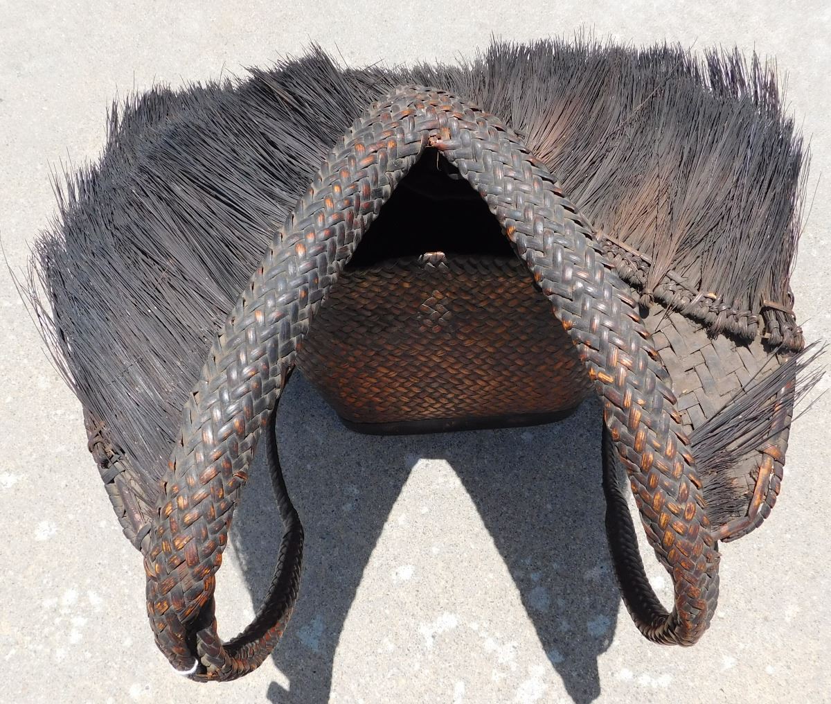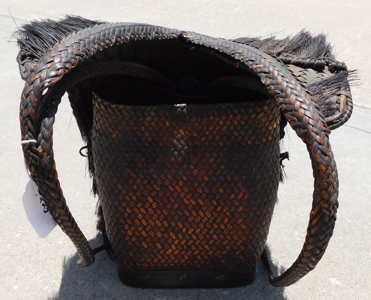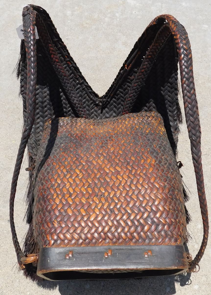 This is a very unusual possibly Indonesian Island back pack and basket. It is dated from the 1930's and measures 16 x15x16 inches. It is in good condition with some patina. There is a small basket within the back pack. Item is made from basketry and fiber. Shipping: $60 This item came from estate of long time collector in the San Diego area.