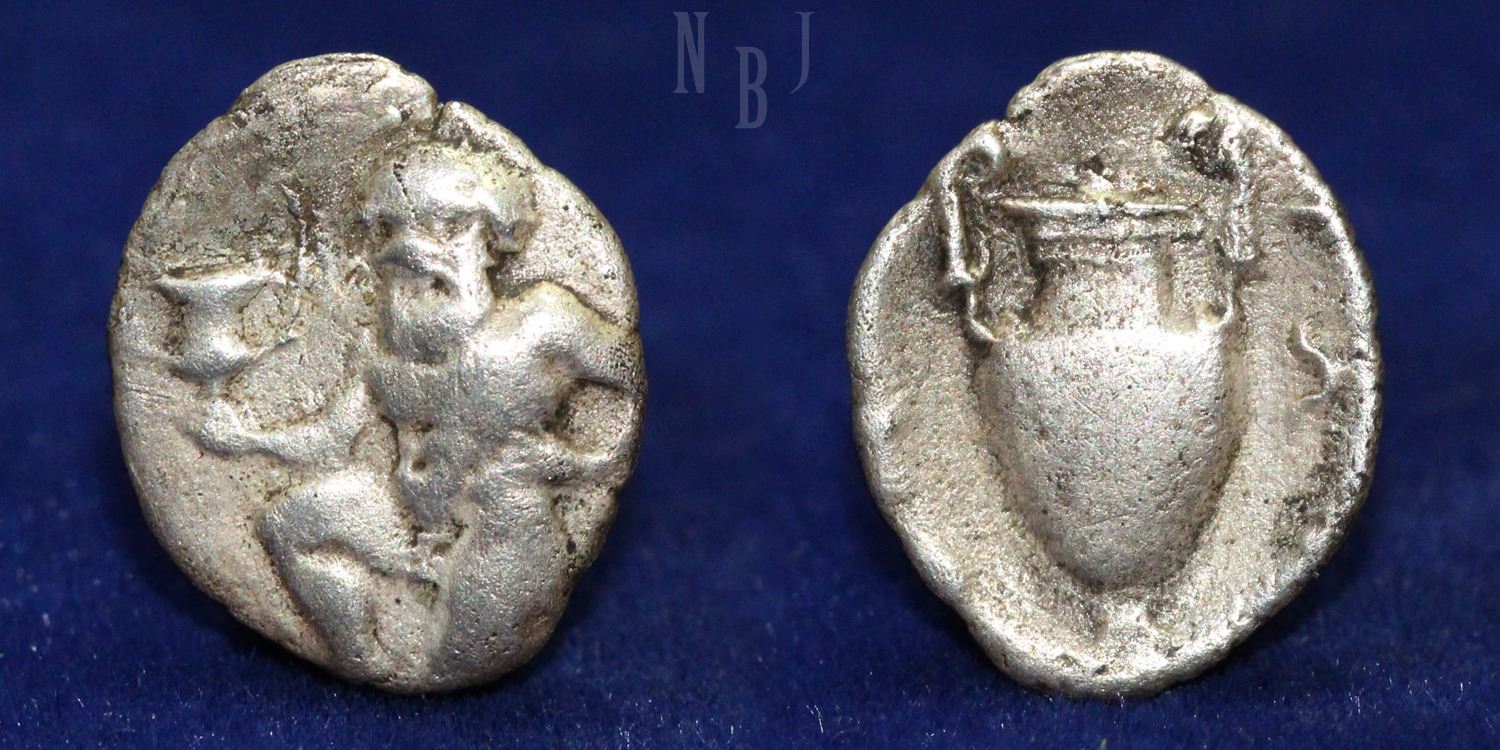 Islands off Thrace: Thasos AR Trihemiobol. Circa 404-340 BC. Satyr running to left, holding kantharos / Amphora; ΘAΣΙΩÎ! around. (0.72gm, 13mm) Very Fine.