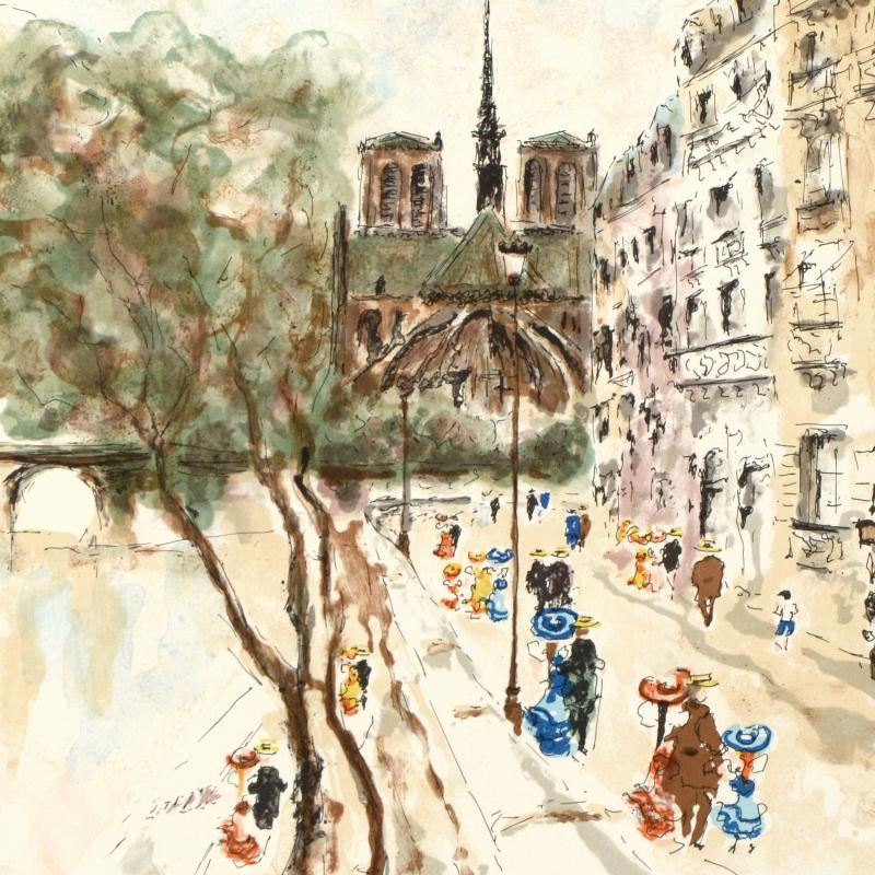 "Isle de Cite" is a limited edition lithograph on paper, numbered and hand signed by the artist! Measures approx. 21" x 29.5" (border). 19" x 27" (image).