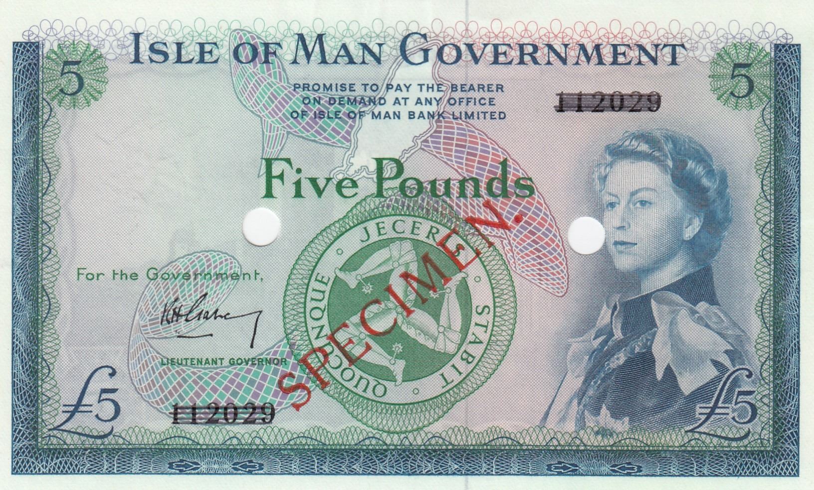 Isle of Man, 5 Pounds, 1961, UNC, p26s, SPECIMENbr/Queen Elizabeth II portrait, serial number: 112029