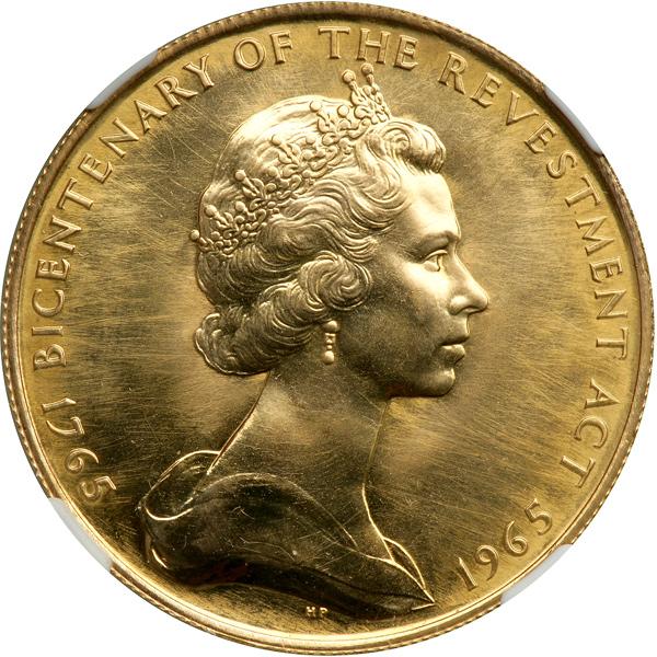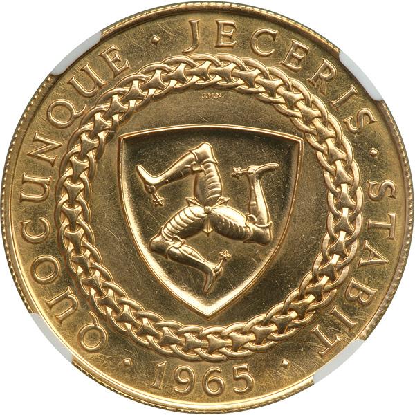 Isle of Man. 5 Pounds, 1965. Fr-1; KM-17. Weight 1.1776 ounces. Elizabeth II. 200th Anniversary of Acquisition. Triskelis in shield. Mintage 500 pieces. NGC graded MS-67.