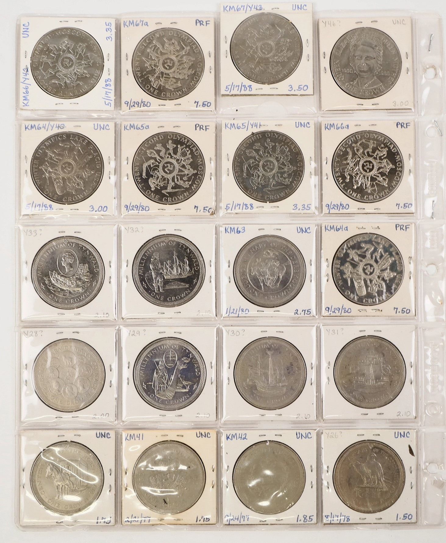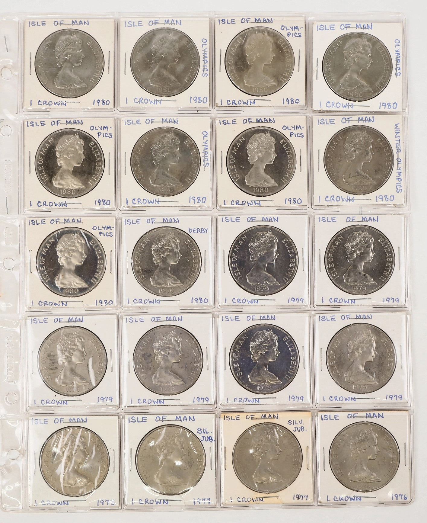 Queen Elizabeth II is featured on all 20 of these commemorative one crown coins issued by the Isle of Man from 1976-1980.