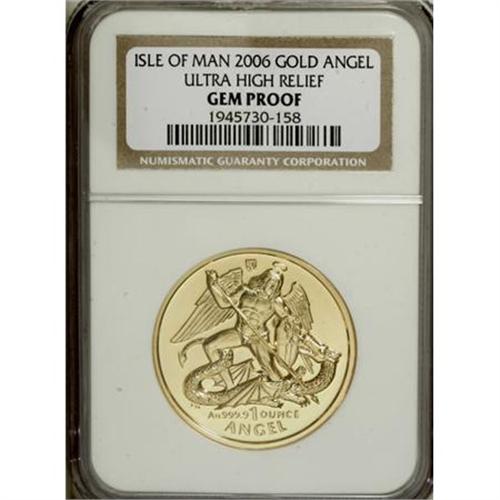 <B>Gold Proof Angel 2006,</B></I> Elizabeth II elderly portrait, not yet listed in Krause, 1 ounce of glittering, nearly perfect gold, as shown by our illustrations, graded Gem Proof "Ultra High Relief" by NGC and accompanied by the Pobjoy Mint's certificate of authenticity which gives a brief history of the angel. Only 1,000 minted for worldwide sale.<BR><BR><b>Shipping:</b> Coins & Currency (<a target="_blank" href="http://www.heritageauctions.com/common/shipping.php">view shipping information</a>)