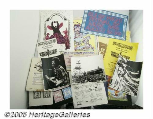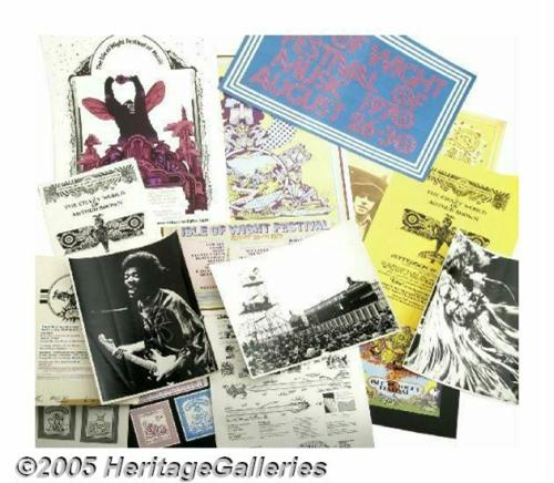 <B>Isle of Wight Festival of Music Archive Group (1968-70).</B></I> Here's an incredible treasure trove of posters, photos, passes, and other memorabilia related to that greatest of English music festivals, ths Isle of Wight "Great South Coast Bank Holiday Pop Festival." Included in this tremendous collection: 1968 Isle of Wight poster printed in yellow and black, featuring the Crazy World of Arthur Brown; Jefferson Airplane; Tyrannosaurus Rex; the Move; the Pretty Things; Fairport Convention; and more. The 14" x 20" poster has been folded, and is in VG condition. Also, two smaller (10.5" x 17") black and white posters for '68, in VG++ condition. The Isle of Wight 1969 poster, measuring 18" x 25", with a line-up including the Who; Moody Blues; Joe Cocker; Free; Family; Blodwyn Pig; King Crimson; Bob Dylan; and more. This poster has several minor folds, plus a .5" tear on the center of the left side. There are four 1970 full color posters featuring Jimi Hendrix, the Doors, Joni Mitchell, the Who, and many more. They measure 20" x 30"; three are VG++, one poster has been folded, and is in VG. There's also a 15" x 23.75" color logo poster for 1970 that has been folded; it's in VG++. In addition, there's a 20" x 30" Donovan promo poster, probably from 1970; it has some light tape stains from being hung on a wall and some very minor damage to all four corners, otherwise it is in VG. There are four proofs for an ad in Melody Maker magazine measuring 14" x 18" in VG+; an ad promo board for New Musical Express magazine, measuring 11" x 15" in NM; two Press Pass proofs measuring 10" x 15", and a Press Pass sample 15" x 20" board with four different passes, plus a 45 single sleeve for the Isle of Wight Festival Song ("Let the World Wash In"), all in NM condition; the '70 Tour Book cover art mounted on 15" x 20" board, VG+; plus three black and white photos: a shot of the stage with the crowd (no band) in NM; Jimi Hendrix (has three folds with minor damage), VG; and a fantastic shot of the Who's Roger Daltrey in his fringed jacket (NM), all from 1970. All together, a total of 23 items are included. This may be a once in a lifetime chance to own such a collection!