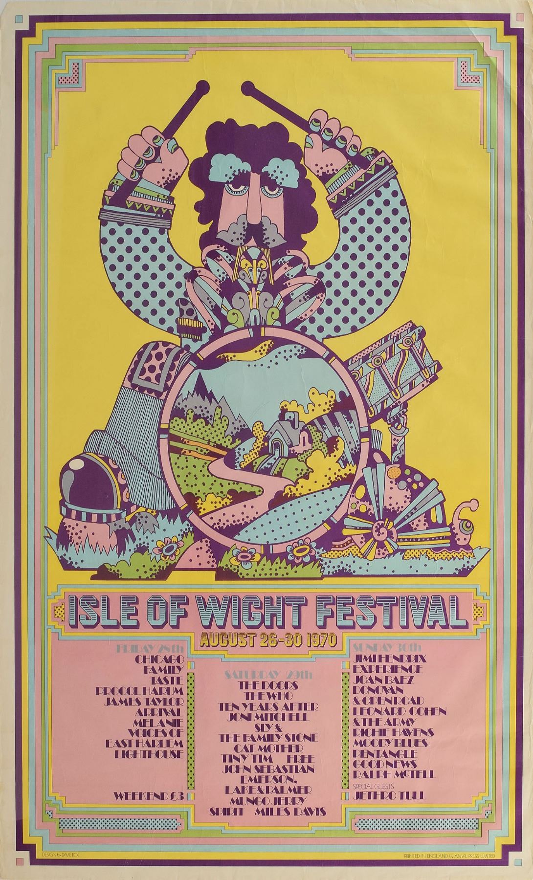 Original color 20 x 30 poster for the third Isle of Wight Festival, August 26–30, 1970, designed by Dave Roe and printed by Anvil Press Limited in England, featuring a kaleidoscopic depiction of a drummer and a list of acts such as Jimi Hendrix Experience, The Who, The Doors, Joni Mitchell, Miles Davis, Jethro Tull, Moody Blues, and more. Rolled and in fine condition, with slight edge wear.