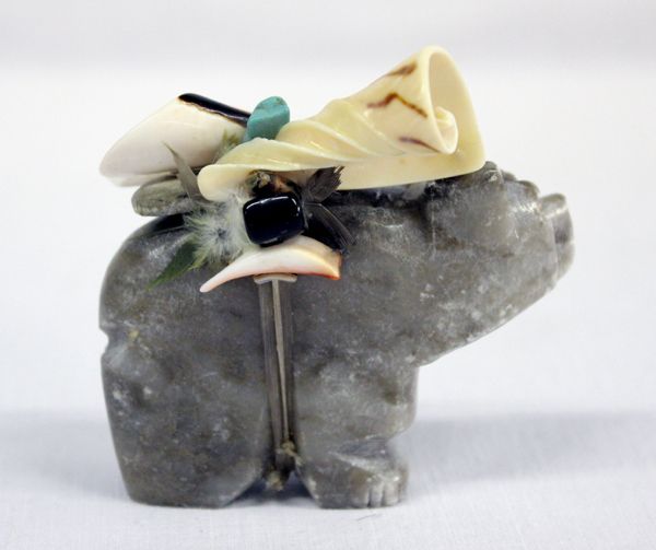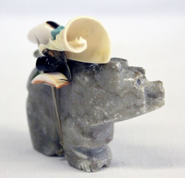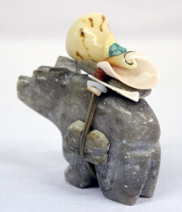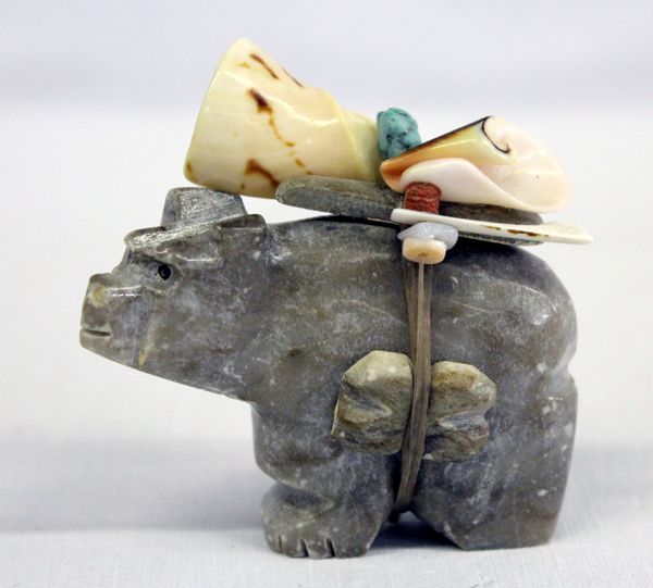 Isleta Bear Fetish with stacked power pack by Andy Abeyta, measures 2.5''H x 2.5''L x .75''W, on the bottom of the fetish you will see Andy's carved Initials ''AA'', Andy Abeyta is from the Isleta Pueblo in New Mexico