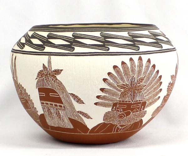 Exquisite 1989 Native American Isleta Carved Pottery Bowl by Vernon & Bert Jojola, measures 7.5'' x 5.5'', beautifully carved Kachina figures, very fine details, signed on the bottom, work intensive piece