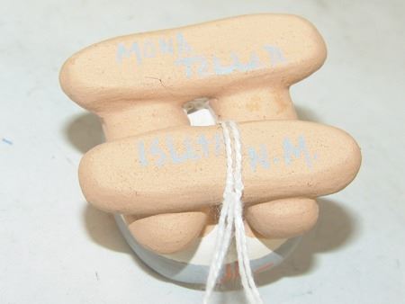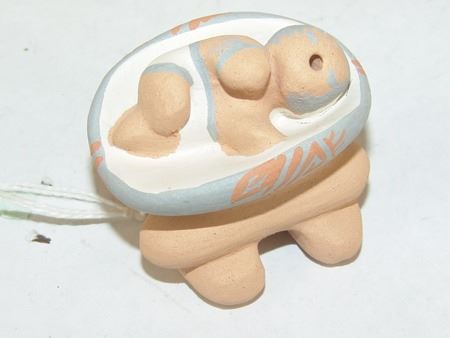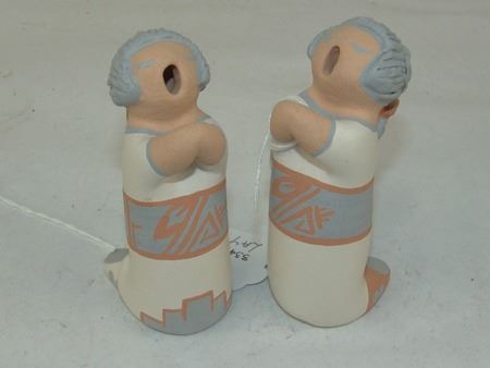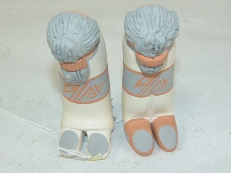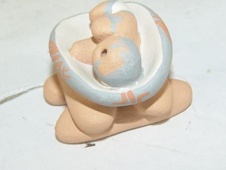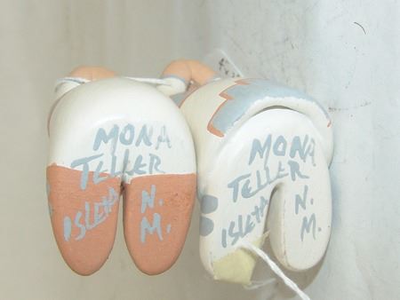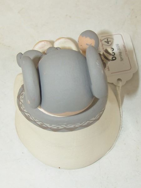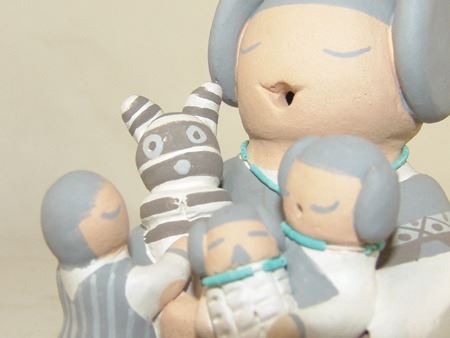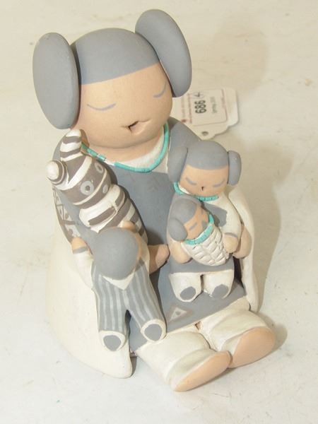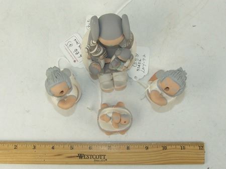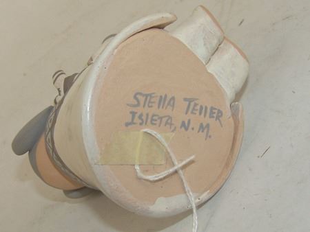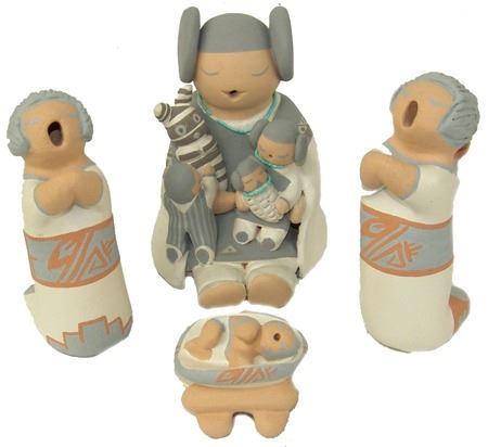 Early 2000s, A beautiful storyteller by master potter Stella Teller, plus a three-piece (Joseph, Mary, Baby Jesus) manger scene by Mona Teller, her daughter. 1-3/4" x 1-3/4" x 1-1/4" to 4" x 4" x 3"