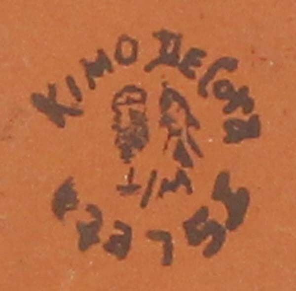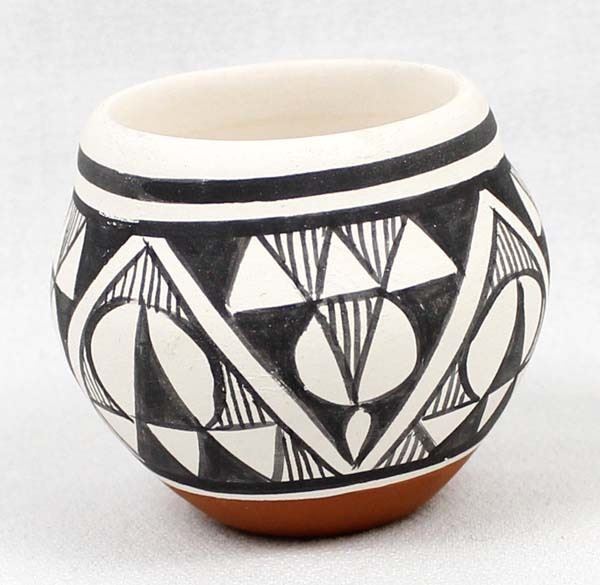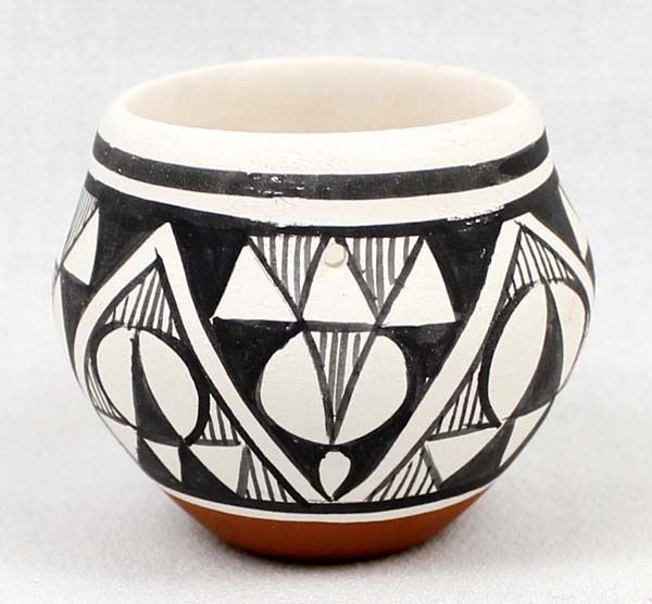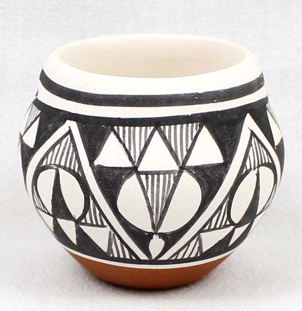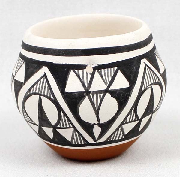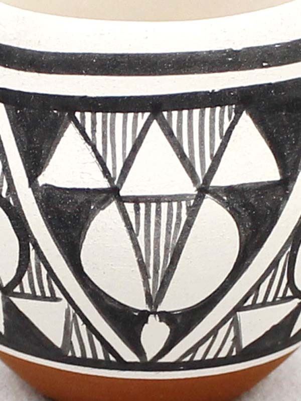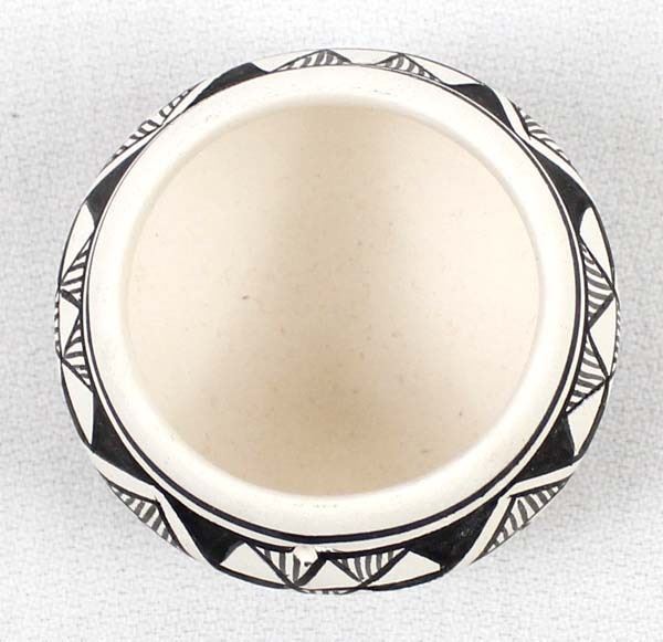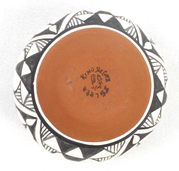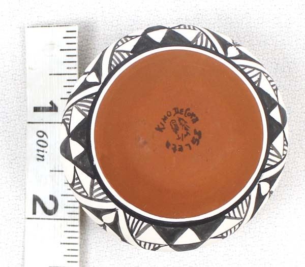 Native American Isleta Miniature Pottery Jar by Kimo DeCora, measures 2'' x 2'' and is signed on the bottom, has 2 opposing drilled holes, FYI: ''Kimo DeCora is an award-winning potter from Isleta Pueblo. His heritage is 1/2 Isleta, 1/2 Winnebago. He specializes in delicate black on white miniature pieces, usually decorated with Mimbres-style designs.''