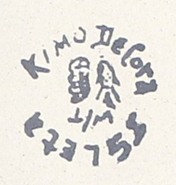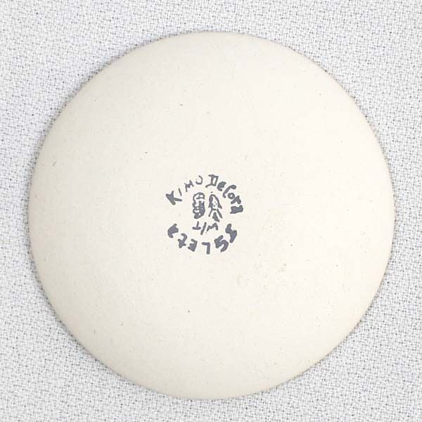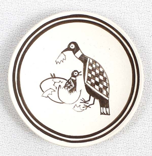 Native American Isleta Miniature Pottery Plate by Kimo DeCora, measures .25'' x 2'' and is signed on the bottom, Mimbres Bird Design, FYI: ''Kimo DeCora is an award-winning potter from Isleta Pueblo. His heritage is 1/2 Isleta, 1/2 Winnebago. He specializes in delicate black on white miniature pieces, usually decorated with Mimbres-style designs.''