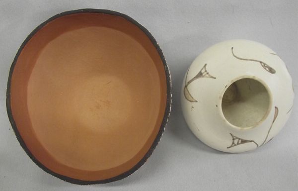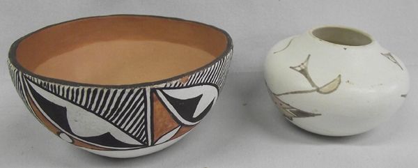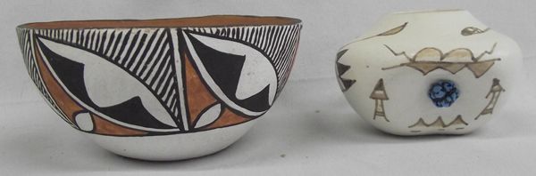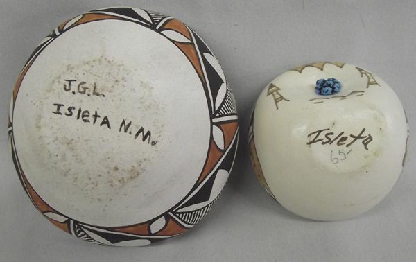 Isleta Pottery Bowls, both are marked on bottom Isleta, one is hallmarked J.G.L., traditional abstract and geometric Native American designs, the small bowl has been embellished with a small turquoise nugget, 3.75''D x 1.75''