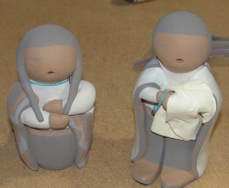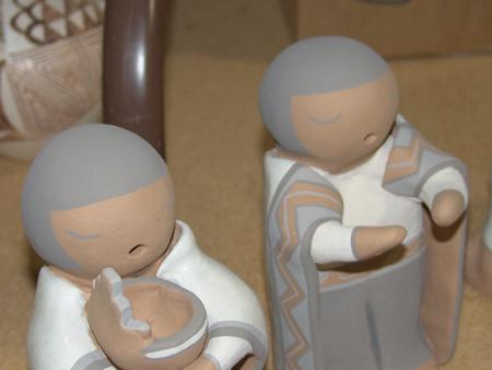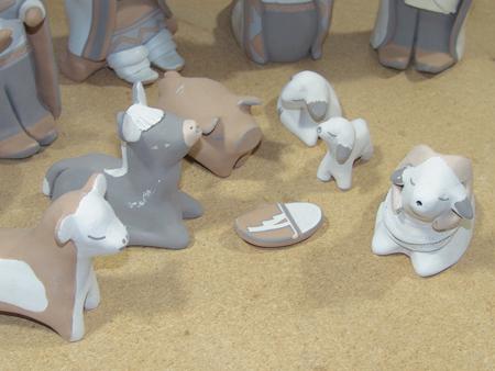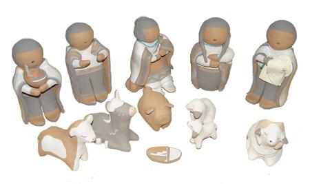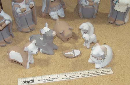 Beautiful hand formed and painted 12-piece polychrome nativity scene - Mary is shown seated and holding the baby. Condition: very good, minor handling. 2" to 6-1/2"