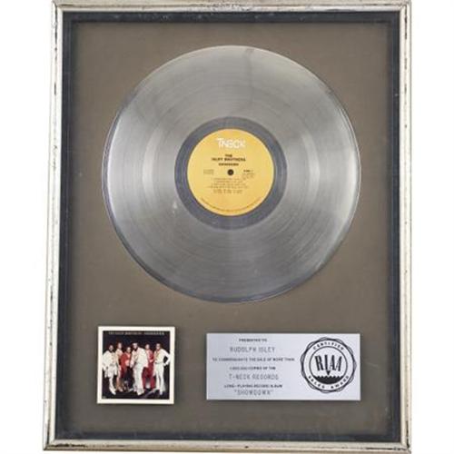 <B>Isley Brothers</B></I> <B><I>Showdown</B></I></B></I> <B>RIAA Platinum Album Award.</B></I> Presented to Rudolph Isley to commemorate the sale of more than one million copies of the Isley Brothers' 1978 Funk/Soul LP. Framed to an overall size of 17" x 21" and in Very Fine condition with some wear to the frame.<BR><BR><b>Shipping:</b> Framed - with Glass, Medium (<a target="_blank" href="http://www.heritageauctions.com/common/shipping.php">view shipping information</a>)