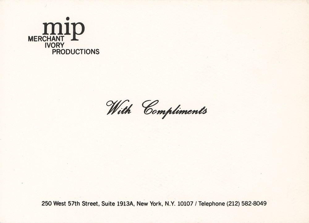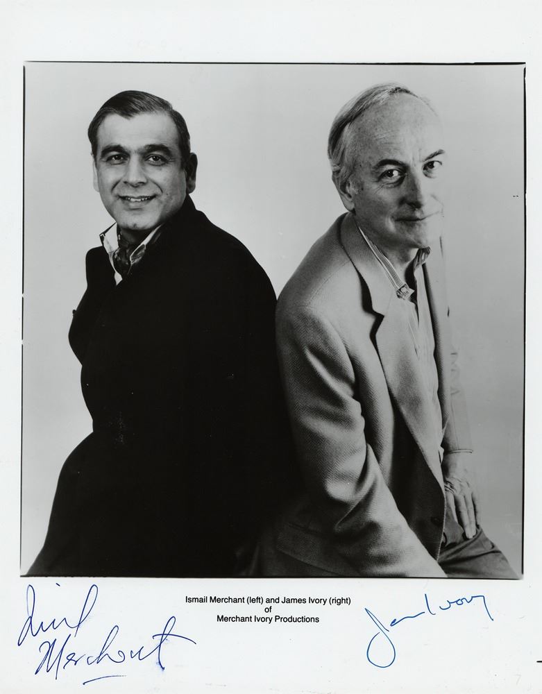 Glossy 8 x 10 publicity photo of professional and domestic partners Ismail Merchant and James Ivory of Merchant Ivory Productions, signed by both in the lower border in blue ink. In fine condition. Accompanied by a compliments card from MIP Productions. A typical 'Merchant-Ivory film' would be a period piece set in the early 20th century, usually in Edwardian England, featuring lavish sets and top British actors portraying genteel characters who suffer from disillusionment and tragic entanglements. The studio's more notable films include A Room with a View, Howards End, The Remains of the Day, and Call Me By Your Name.