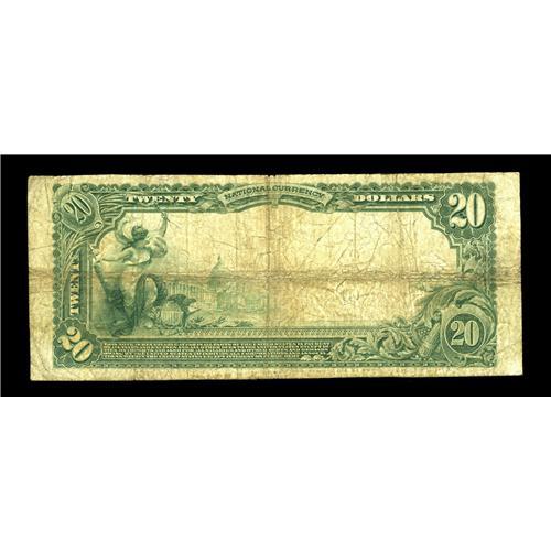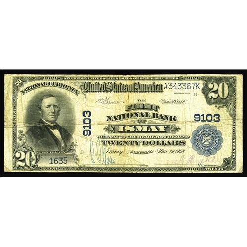 <B>Ismay, MT</B></I> - $20 1902 Plain Back Fr. 652 <B>The First NB</B></I> Ch. # 9103<BR>A great rarity which is one of just two large notes known from this one bank town. As the other known example is ensconced in a major Montana holding and is likely to be unavailable to collectors for quite some time, this specimen may well represent the only chance to obtain a large note from here for many years. With a miniscule issue of large notes and a meager $560 outstanding in large size in 1935, we don't look for many more opportunities to arise from here. Pen signed <B>Fine.</B></I>