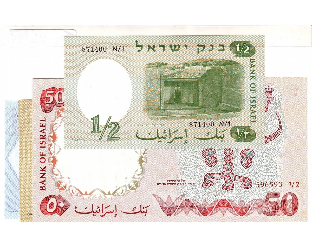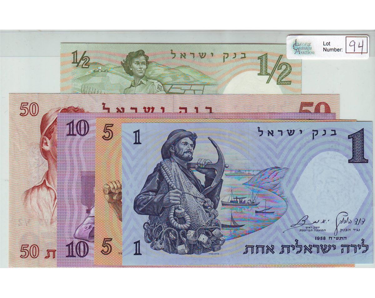 Israel; 1/2 Lira note 1958 Pick # 29a serial 871400 N/1, 1 Lira note 1958 Pick # 30c serial 0869492G/9, 5 Lirot note 1958 Pick # 31a serial 392544 N/3, 10 Lirot note 1958 Pick # 32d serial 795928D/6 & 50 Lirot note 1960 Pick # 33e serial 596593 I/2, all UNC. Lot of 5 notes.