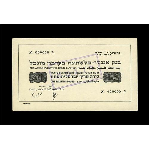 <B>Israel</B></I> $1 Anglo-Palestine Bank Limited 1948 Pick 2p UNL Face Proof<BR>Another uniface piece done in the design of proofs, but stamped in purple in Hebrew as a specimen (or sample). Larger with a different size type face. Also, with imprint at bottom left margin that is not present on the issued piece. <B>Choice Crisp Uncirculated.</B></I><BR><BR><b>Shipping:</b> Coin/Currency (<a target="_blank" href="http://www.heritageauctions.com/common/shipping.php">view shipping information</a>)