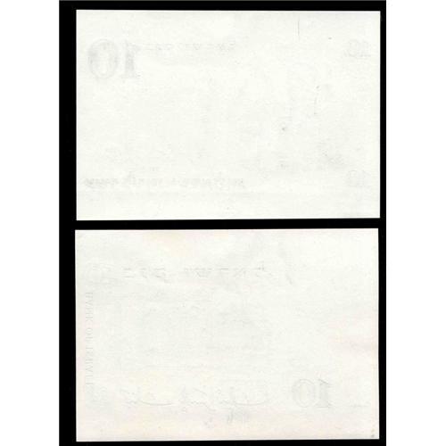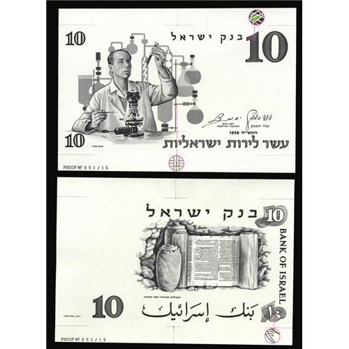 <B>Israel</B></I> 10 Lirot 1958 Pick 32p UNL Face and Back Proofs<BR>Here is another uniface face and back progress proofs, numbers 893/15 and 893/19. Again, they are mostly black and white and printed on light cream colored bank note paper. Neither of these highly elusive proofs has an underprint. <B>Crisp Uncirculated.</B></I>