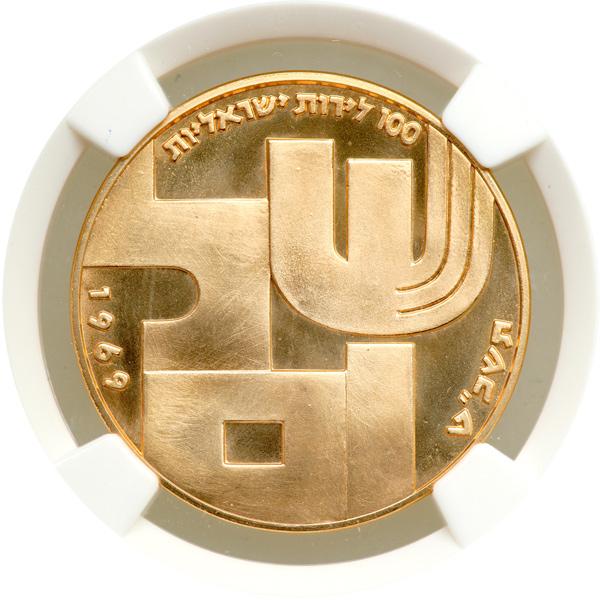 Israel. 100 Lirot, 1969. Fr-7; KM-54. Weight 0.6430 ounce. On the 21st Anniversary of Independence. Shalom. NGC graded Proof 65 Cameo.