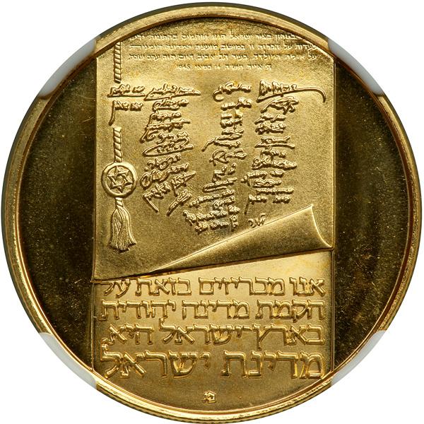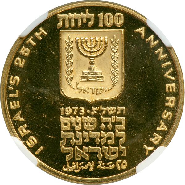Israel. 100 Lirot, 1973. Fr-10; KM-73. Weight 0.3906 ounce. 25th Anniversary of Independence. Text on scroll. NGC graded Proof 68 Cameo.
