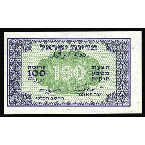 <B>Israel</B></I> 100 Pruta (1952) Pick 12c Choice CU</B></I><BR><B>Israel</B></I> 100 Pruta (1952) Pick 12d AU.</B></I><BR>Here is a wonderful comparison pair with the regular and the famed inverted Neeman signature at left <B>error</B></I> note. The error has "35" in blue ink on back and it has toned a shade, nonetheless this piece is extremely difficult to find.<BR>