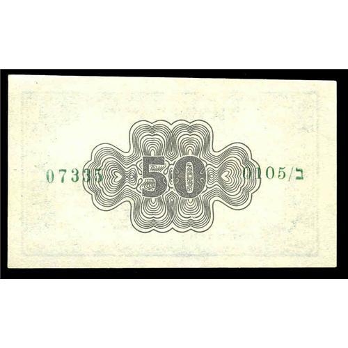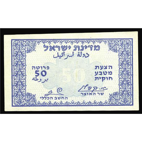 <B>Israel</B></I> 50 Pruta (1952) Pick 8<BR>This note is printed in a horizontal format and it is the first type denominated in Pruta. It is very scarce in the upper grades. <B>Choice Crisp Uncirculated.</B></I>