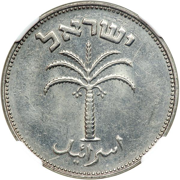 Israel. 100 Pruta, 1954. KM-19; Haffner-P23. Utrecht mint. Indicated by Haffner, the Utrecht die has not been seen in brilliant uncirculated condition. Choice mint state example (catalog value in KM $1000) among the few this nice. Rare variety. NGC graded MS-63.