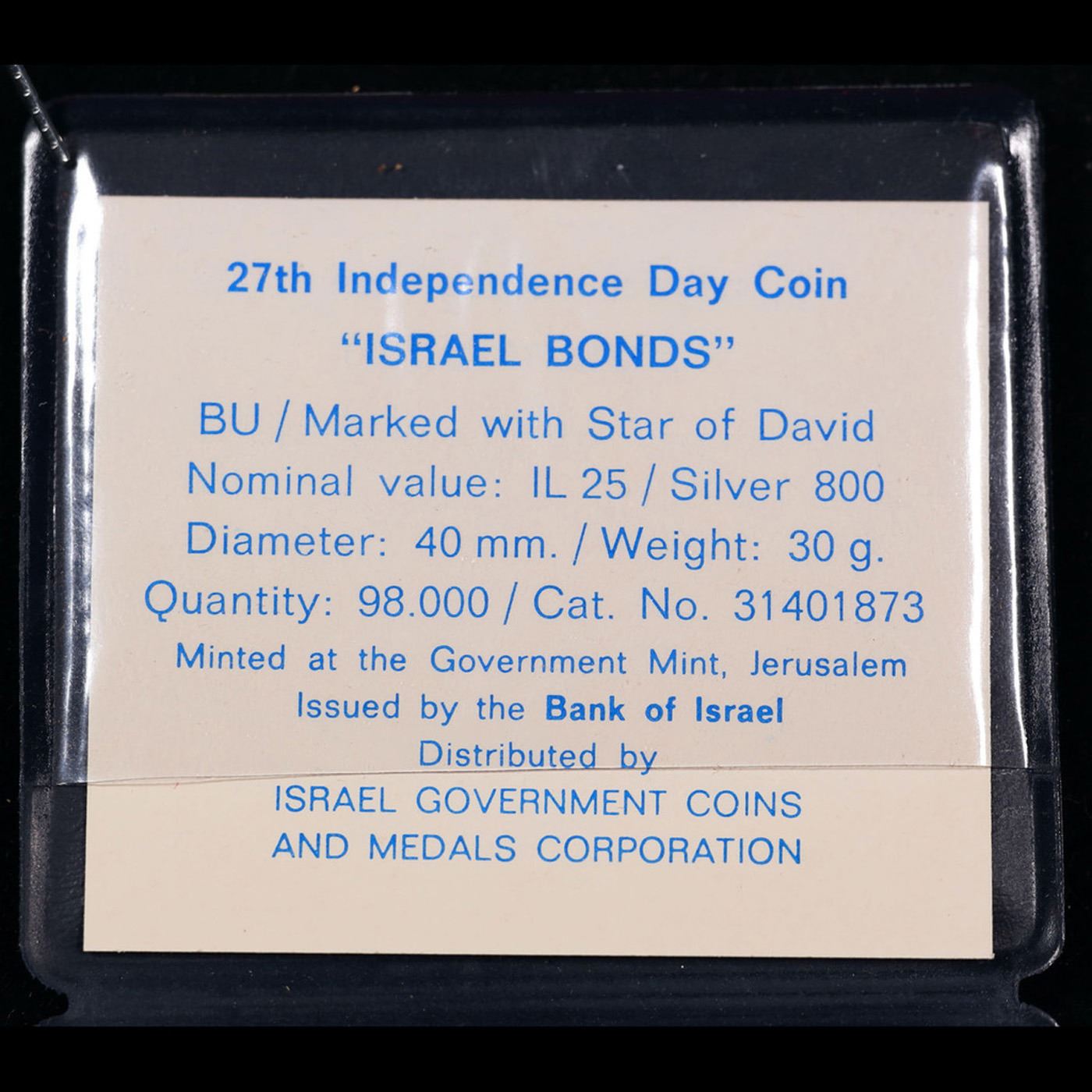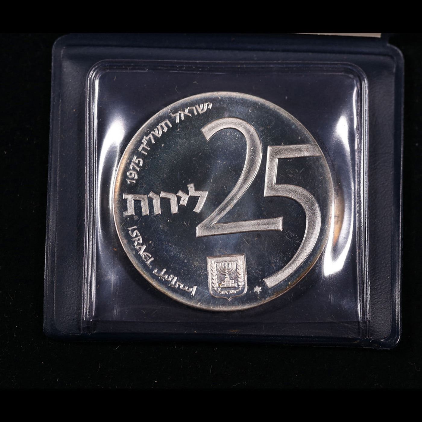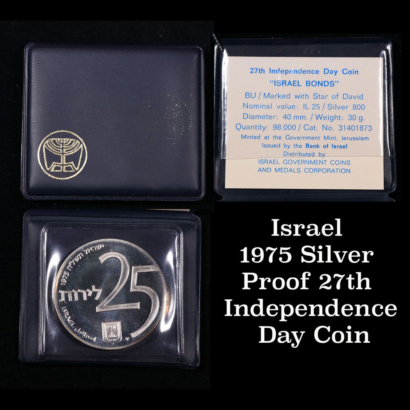 Israel 1975 Silver Proof 27th Independence Day Coin. Come in original government issue case and COA. n September 1952, the Prime Minister of Israel, the late David Ben-Gurion convened a conference in Jerusalem of sixty American Jewish leaders to discuss plans for issuing Israel Bonds. The plan called for the raising of large sums of capital for the rapid development of an economic infrastructure for the young State. Nearly a year later at a conference of major American Jewish organizations and communities, the first issue of the State of Israel Bonds was launched. The proceeds from the sale of Israel Bonds, with 85 per cent coming from the United States, were used by the Government of Israel, as part of its development budget to expand roads, rail, sea and air transport facilities, develop water supply and electric power, exploit natural resources and for many other projects.