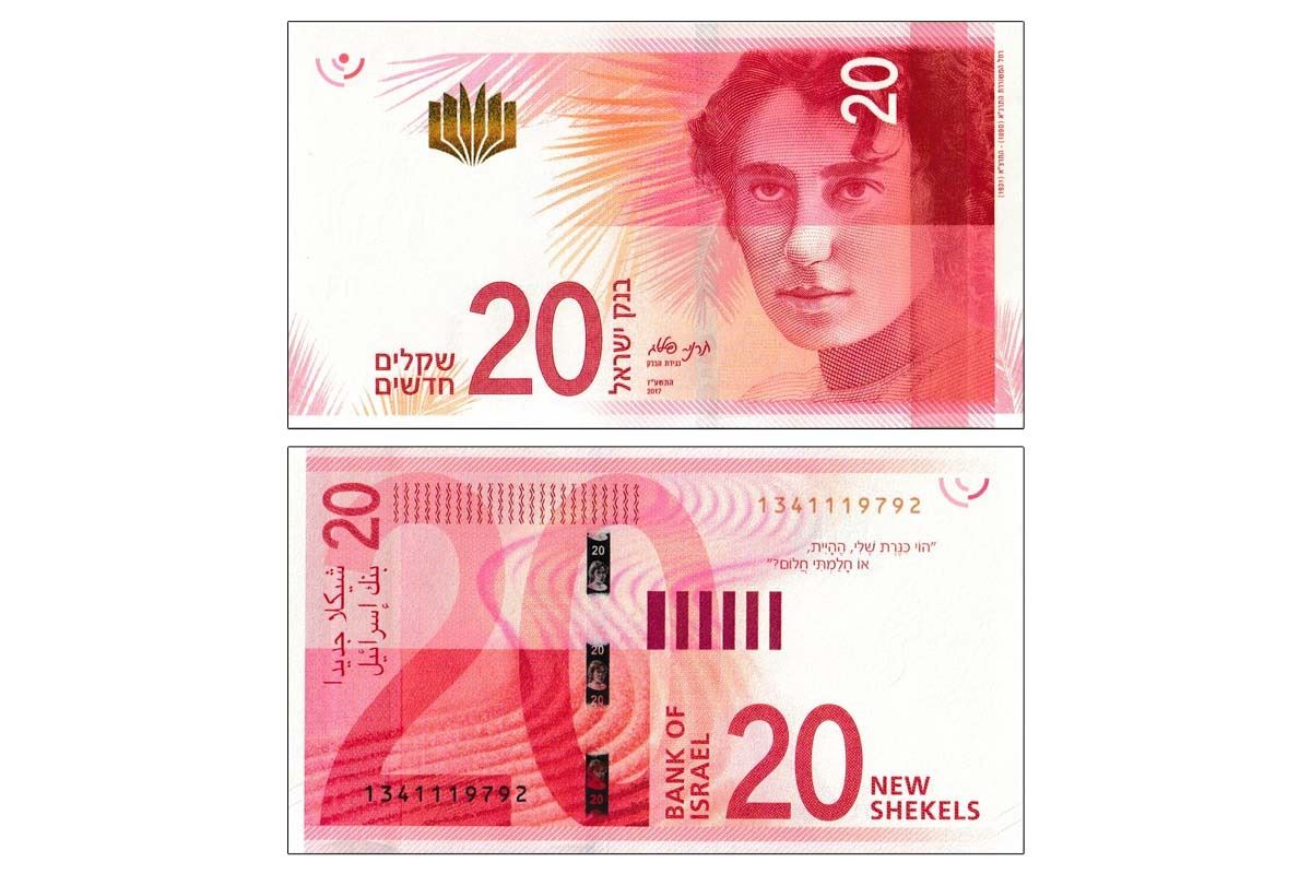 Israel, 20 New Shekels, 2017 Bank of Israel issue, Obv. A portrait of Rachel the Poetess against a background of palm tree fronds, Rev. A classic view of the Lake Kineret shoreline. Inspired by the poem “Kineret”. Also lines from Rachel the Poetess’s poem “Kineret” and lines from her poem “And Perhaps It Never Happened…”, (P#65), UNC, Rare.