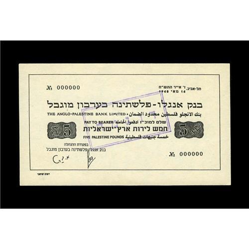 <B>Israel</B></I> $5 Anglo-Palestine Bank Limited 1948 Pick 3p UNL Face Proof<BR>A rare uniface piece done in the design of proofs, but stamped in purple in Hebrew as specimen (or sample). Larger with different size type face and the imprint at the bottom left margin which is not present on the issued piece. <B>Choice Crisp Uncirculated.</B></I><BR><BR><b>Shipping:</b> Coin/Currency (<a target="_blank" href="http://www.heritageauctions.com/common/shipping.php">view shipping information</a>)