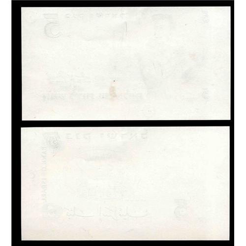 <B>Israel</B></I> 5 Lirot 1958 Pick 31p UNL Face and Back Proofs<BR>Uniface face and back progress proofs, numbers 893/11 and 893/12 are in this lot. They are mostly black and white and printed on light cream colored bank note paper. Neither proof has an underprint. Slight handling at upper center is noticed on these very difficult to find items. <B>Choice About Uncirculated.</B></I>