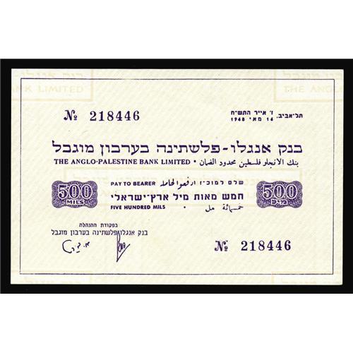 <B>Israel</B></I> 500 Mils Anglo-Palestine Bank Limited 1948 Pick 1a<BR>Ready for issue, but never released. Bank name in underprint on face and back; denomination and text in lilac. Exceedingly rare; according to the Standard Catalog, only a few notes were preserved. <B>Choice About Uncirculated.</B></I> <BR><BR><B>Important notice:<