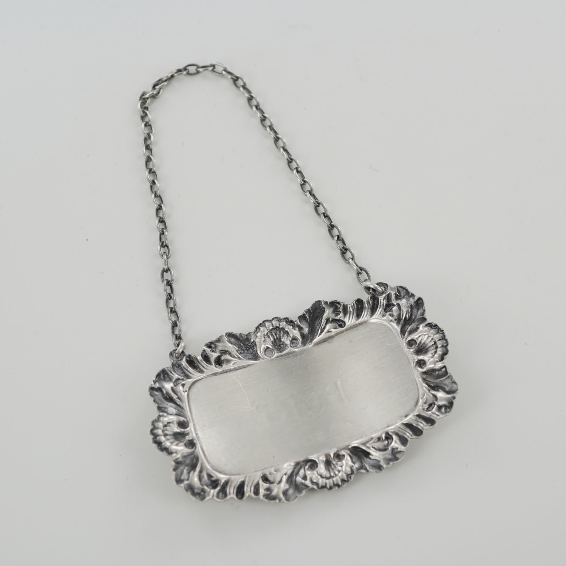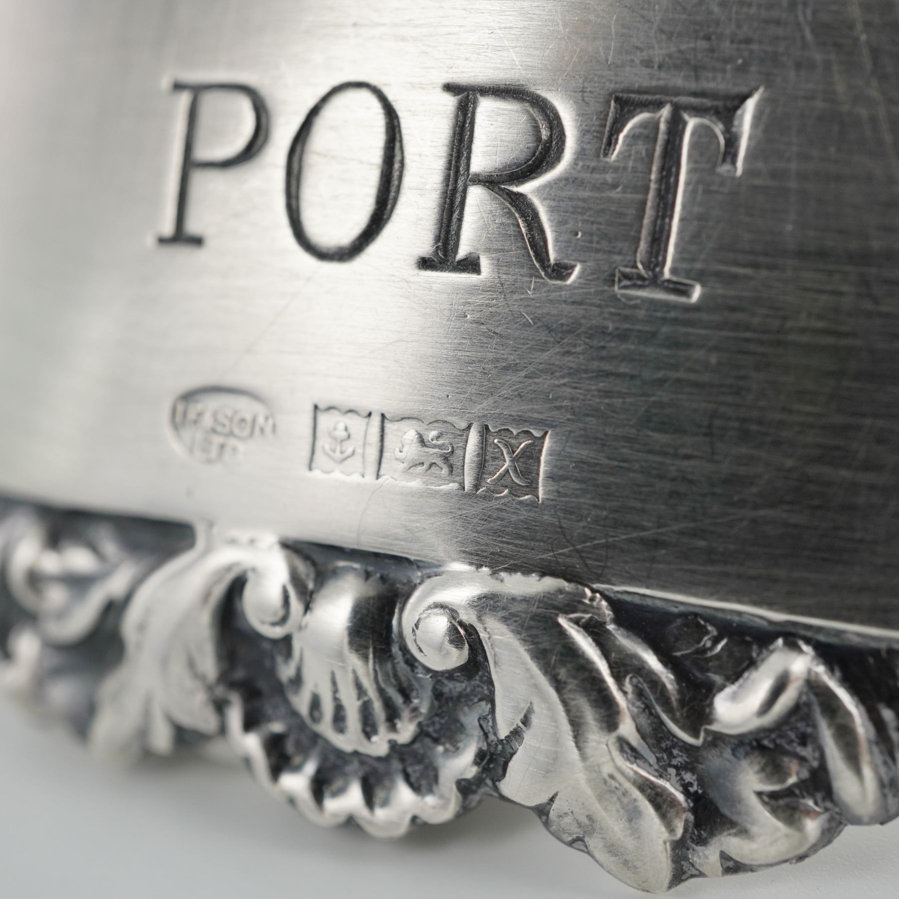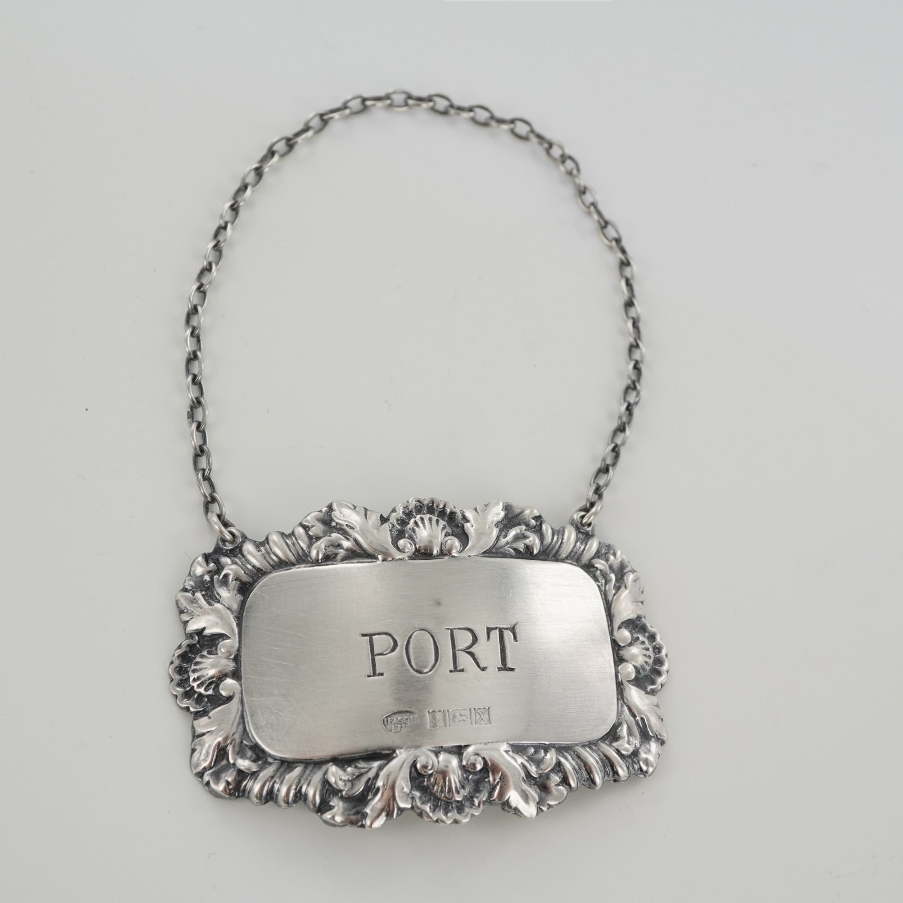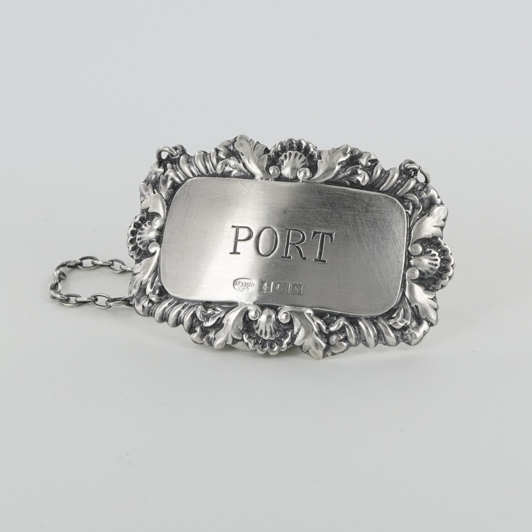 An elegant sterling silver decanter label featuring the word "PORT" engraved in crisp uppercase lettering, suspended by a fine linked chain. The rectangular cartouche is framed by an ornate repousse border of scrolling acanthus leaves and shell motifs, embodying classic Rococo-inspired design. The piece bears full English hallmarks including the anchor for Birmingham, the lion passant for sterling silver along with the maker's mark "IFS LTD" for Israel Freeman & Son Ltd. The net silver of this item is 14g.