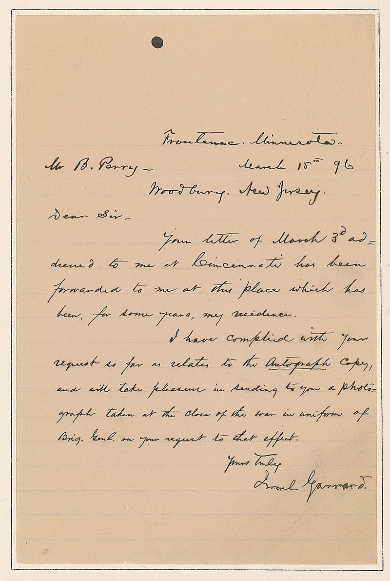 Union general. LS, one page, lightly-lined, 5.5 x 8.5, March 15, 1896. Letter to a gentleman. In part: “I have complied with your request so far as relates to the autograph copy, and will take pleasure in sending to you a photograph taken at the close of the war in uniform of Brig. Genl.” Professionally inlaid into a slightly larger sheet. A couple unobtrusive repairs passing through the signature, otherwise fine condition.
