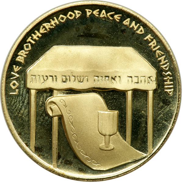 Israel. Gold, Bronze and Silver Medal Set, 1978. Gold 30 mm. 15 grams.750 fine. Silver 37 mm Bronze 58 mm. Wedding. Features a chuppa, ketuba, wine glass and an antique marriage ring. In original case. Lot of 3 medals. Brilliant Uncirculated.