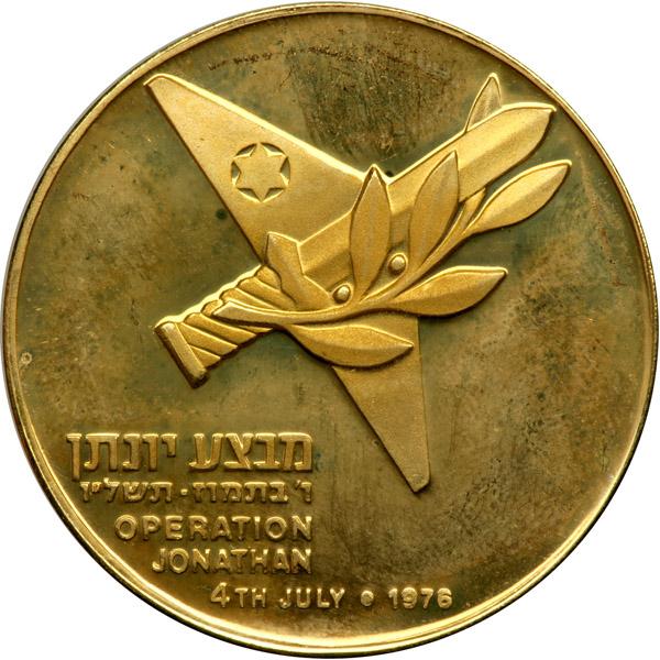 Israel. Gold State Medal, 1976. Weight 30.2 grams.900 Fine. 35.4 mm. Operation Jonathan. Commemorates the rescue of 246 passengers held by terrorists at the Entebbe, Uganda Airport. In original wood box. Proof-Like Brilliant Uncirculated.