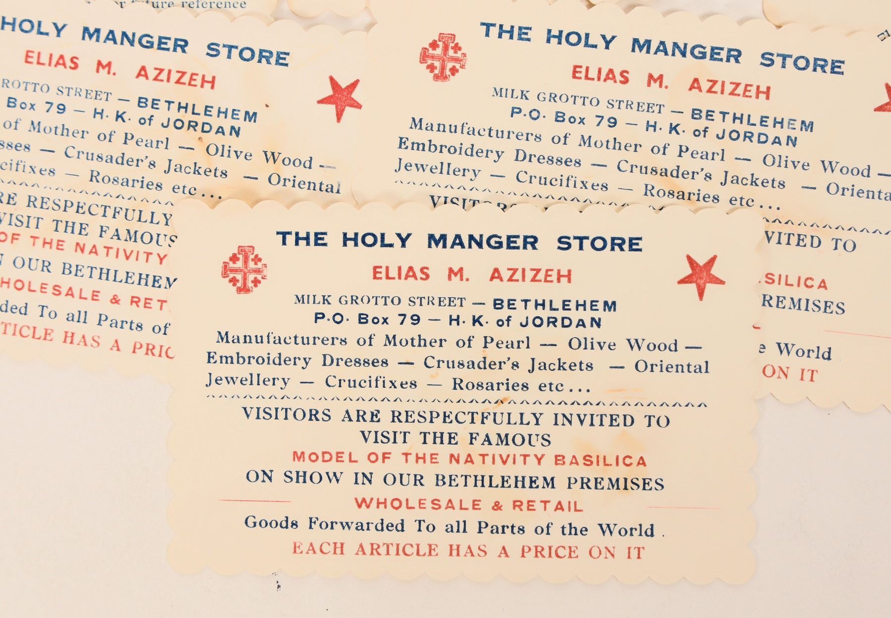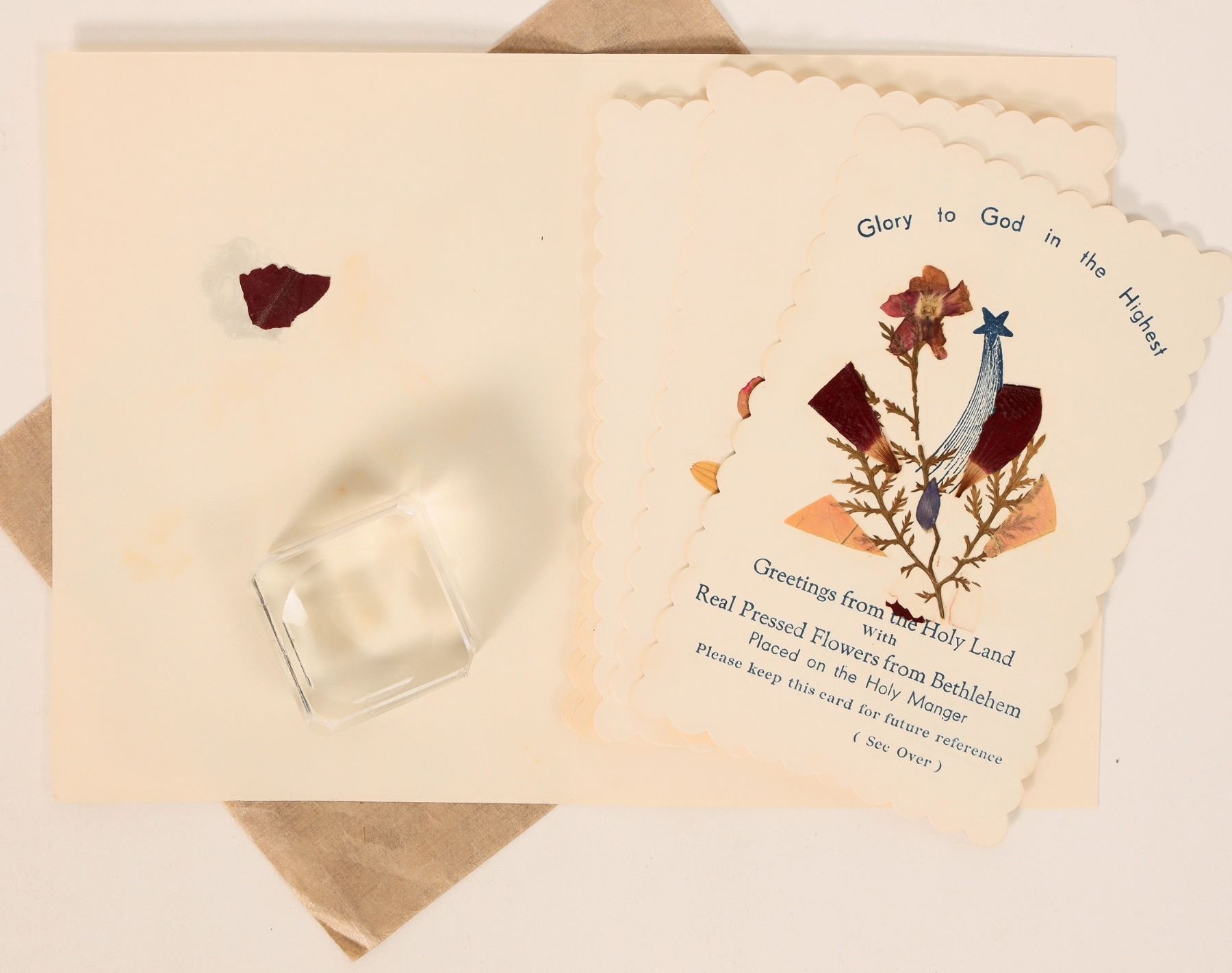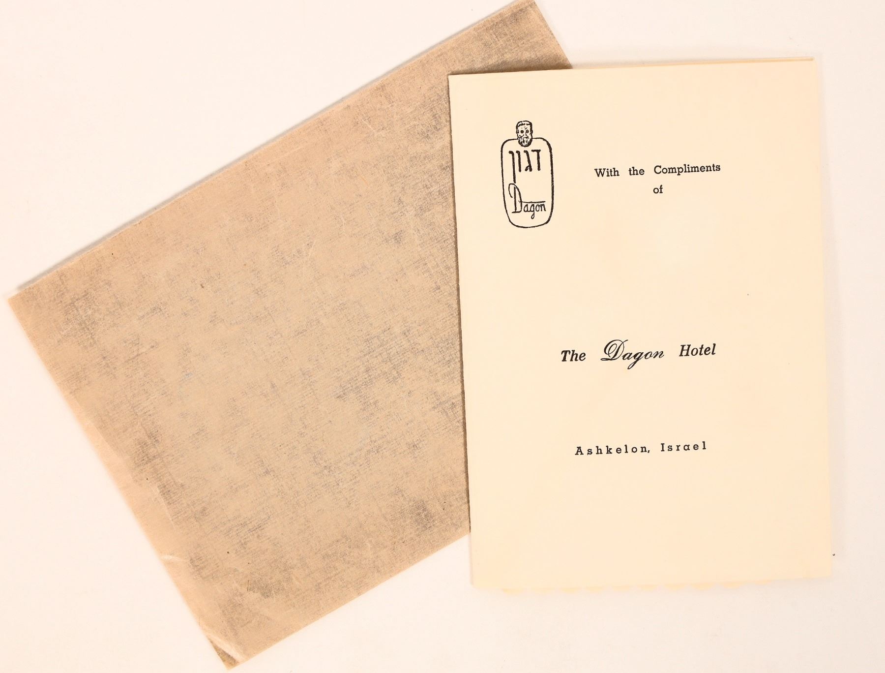 Vintage Dagon Hotel, Ashkelon, Israel, complimentary booklet with 7 business advertisements, with pressed flowers from Bethlehem on verso. Two Israeli postage stamps attached. Envelope included.
