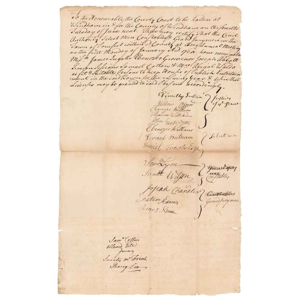 Rare manuscript DS, signed "Israel Putnam," one page, 8 x 12.75, January 1764. Document issued to the Windham County Court, authorizing several individuals as "fit & suitable persons to keep the Houses of Publick Entertainment in the said Town for the ensuing year." Signed by a number of justices of the peace, selectmen (including Israel Putnam) constables, and grand jurymen. In very good to fine condition, with toning, and splitting, to the central horizontal fold.