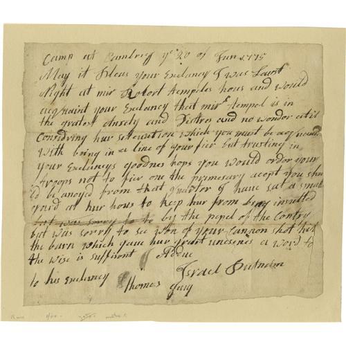 <B>Israel Putnam Excessively Rare Autograph Letter to General Gage, Three Days After the Battle of Bunker Hill!</B></I> Autographed Letter Signed, 1 page, 7.5" by 6.5", Camp at Cambridge, June 20, 1775. To <B> General Thomas Gage,</B></I> under whose command Putnam had just fought at Bunker Hill. The condition of this letter, which has been affixed to a slightly larger sheet, is such that while it is boldly written in dark ink, and quite striking, it is also separated at the folds: restoration, however, will make it a very fine piece. A better letter than this, written just after the first battle of the American Revolution, will be hard to find. A Mrs. Temple's house, Putnam reports, is in the line of fire; a cannon shot hit her barn: he thus offers Gage, most respectfully, "a word to the wise." In full, and with his original spelling: "<I> May it Pleas your Exilancy I was Laust Night at mr Tempels hous and would acquaint your Exilancy that mrs Tempel is in the gratest anxiety and distres and no wonder at it considering her siteuation which you must be aquainted with being in a line of your fier but trusting in Your Exlancys goodnes hope you would ordor your troops not to fier on the primesary acept you shuld be anoyed from that quartor I have sat a small gard at hur hous to keep hur from bing insulted by the pepel of the contry but was sorry to see won of your cannon shot hit the barn which gave hur grait unesenes a word to the wise is suffisont. Addue...</B></I>" So started the American Revolution. From the Henry E. Luhrs Collection. Accompanied by LOA from PSA/DNA.