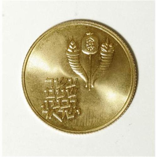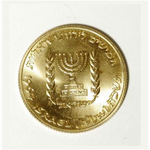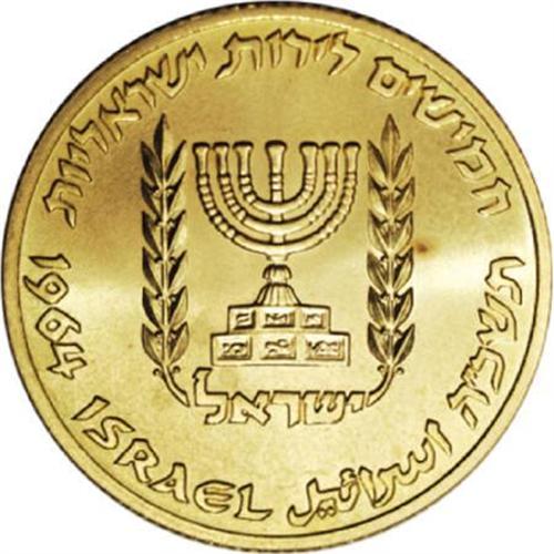 <B>Republic, commemorative gold 50 Lirot 1964,</B></I> KM-44, weighs .3933 oz, appropriately struck to mark the 10th anniversary of the Bank of Israel (who presumably are now hoarding all their gold), a lovely Choice BU coin.<BR><BR><b>Shipping:</b> Coins & Currency (<a target="_blank" href="http://www.heritageauctions.com/common/shipping.php">view shipping information</a>)