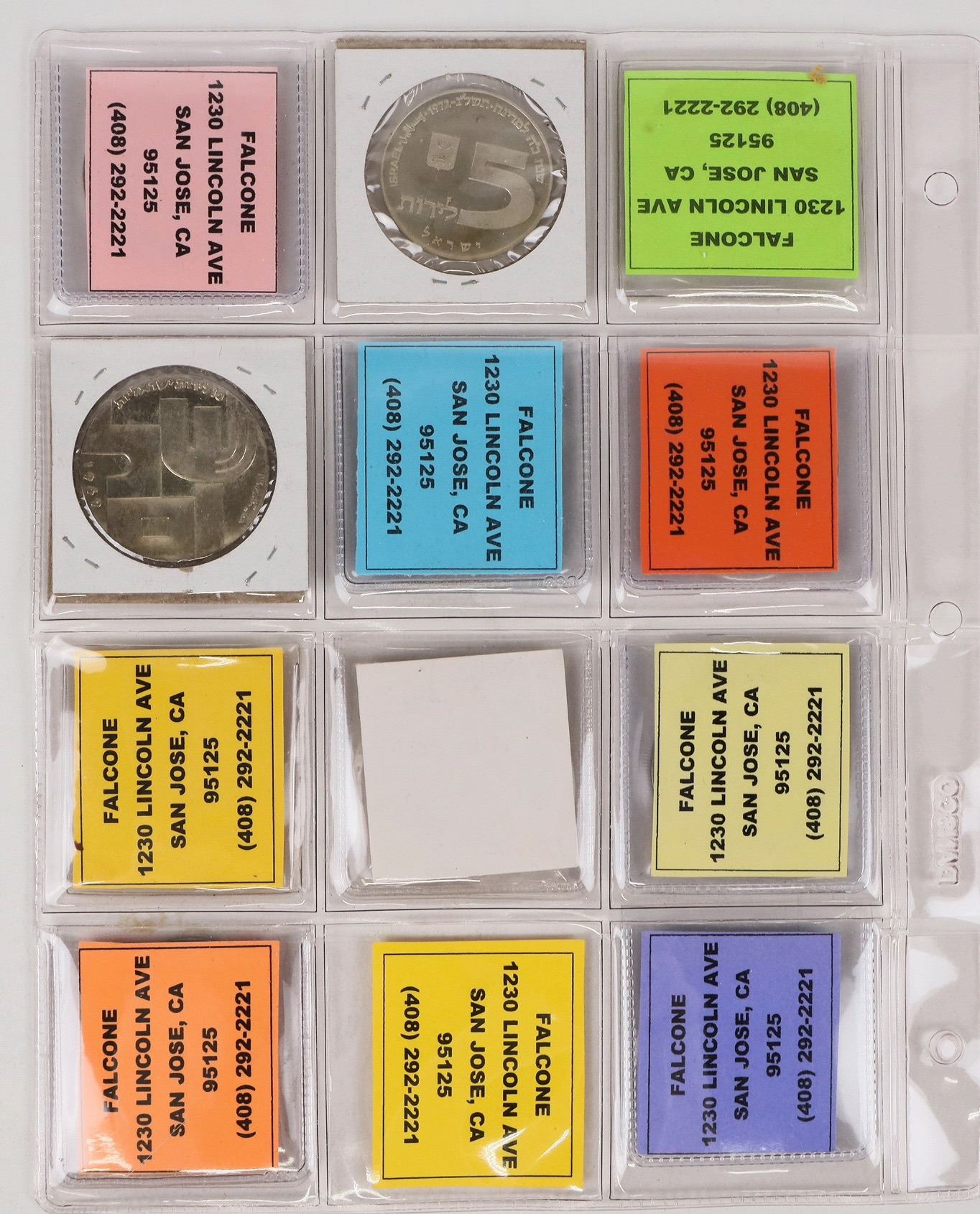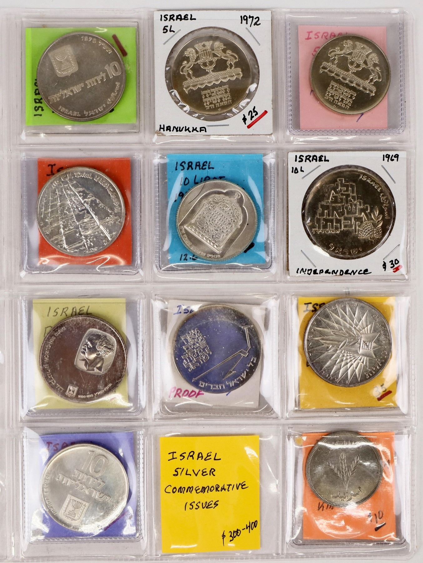 Eleven Israeli commemoratives. Consignor says silver, all appear silver but none are marked. Ben Gurion (.935 silver) ; Hanukka (.750 silver); 1969 Independence (.900 silver); 1949 250 Pruta (.500 silver); 1974 Damascus Lamp (.500 silver); 1967 Wailing Wall 10 lirot (.900 silver); and five more.
