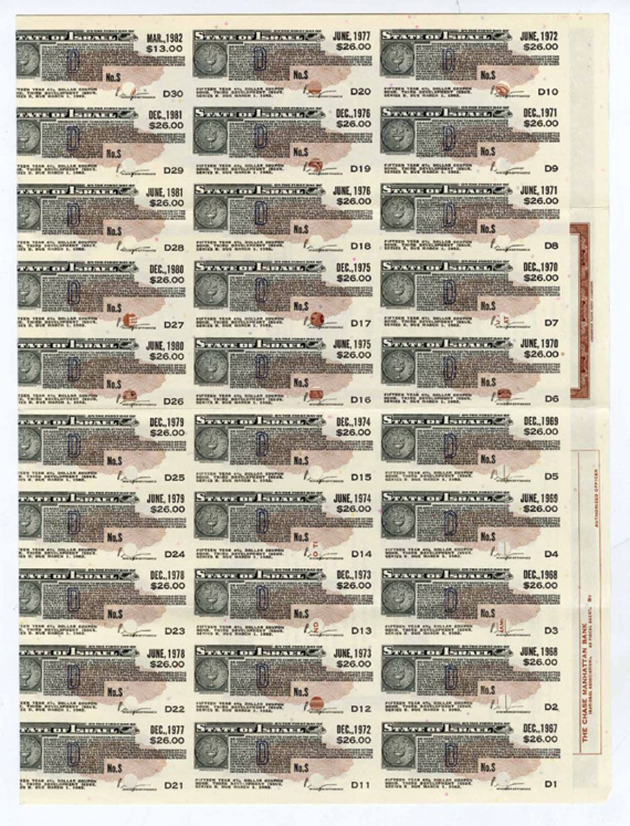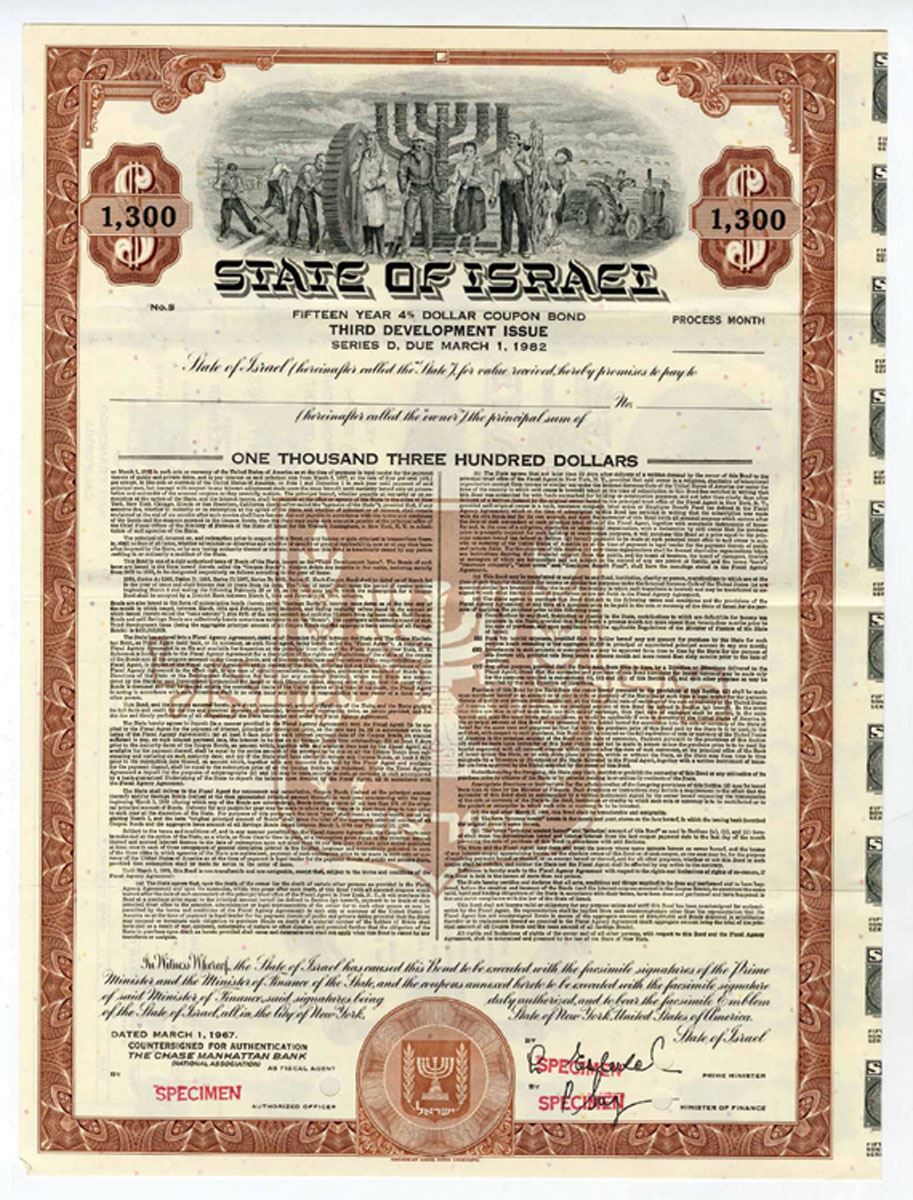 Israel. $1,300 Specimen 4% Series D 3rd Development Issue Coupon Bond, Black print on brown border and undertint, Group of Israeli citizens from all walks of life standing together at top, Specimen overprints and POC's, VF-XF condition, ABNC.