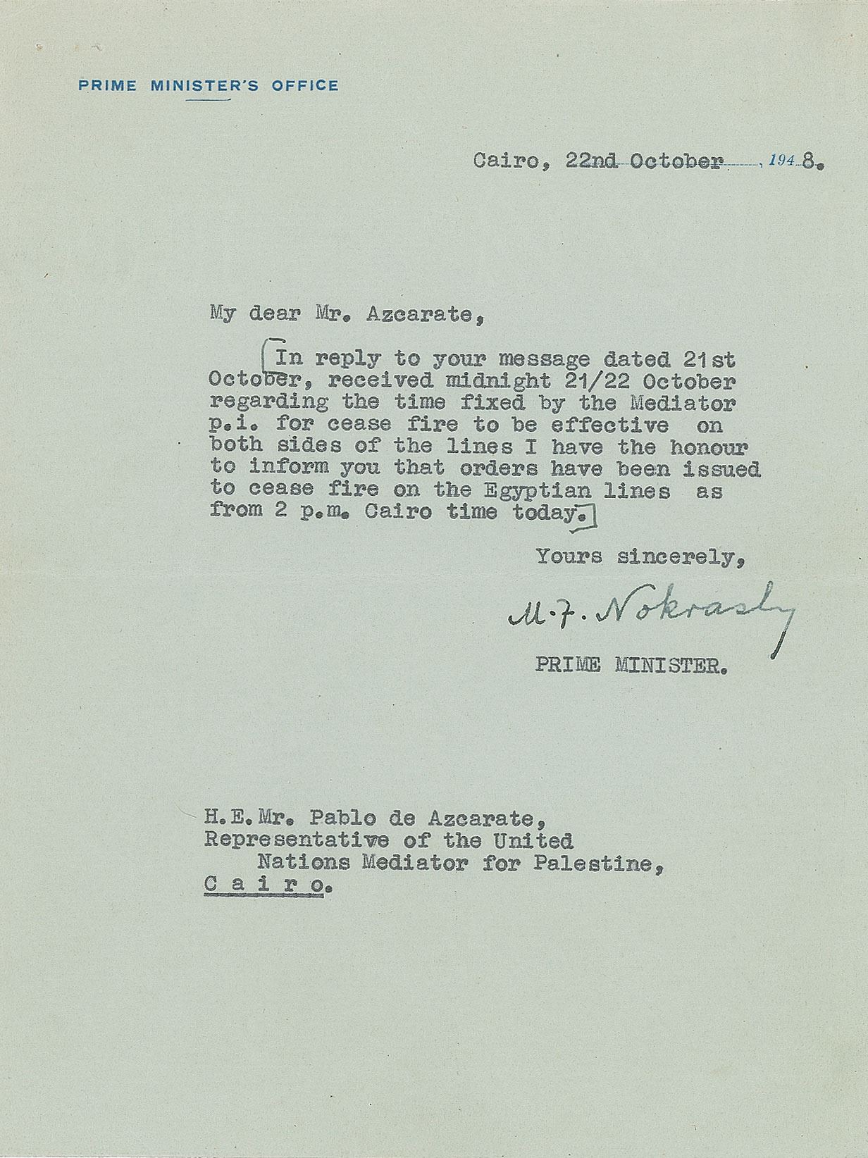 Significant TLS from Egyptian prime minister Mahmoud El Nokrashy Pasha, signed “M. L. Nokrashy,” one page, 6.75 x 8.75, Prime Minister's Office letterhead, October 22, 1948. Letter to Spanish diplomat Pablo de Azcárate, then serving as secretary of the Consular Truce Commission in Jerusalem on behalf of the United Nations, in full: "In reply to your message dated 21st October, received midnight 21/22 October regarding the time fixed by the Mediator p.i. for cease fire to be effective on both sides of the lines I have the honour to inform you that orders have been issued to cease fire on the Egyptian lines as from 2 p.m. Cairo time today." In fine condition.