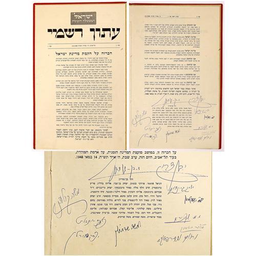<Our item number 139746><B>1st Printing of Israel's Declaration of Independence - Signed By 11 Original Signers.</B> Israel's Provisional Government Official Bulletin No. 1 (14 May 1948) with the complete Declaration of Independence Signed in Hebrew on page two by eleven of the 37 original signers, 3pp, 13½ x 8¼ in., n.p., n.d. Thirty-eight copies of the Declaration of Independence were printed by Bank Leumi and placed in presentation cases; one was given to each of the 37 signers, who were members of the Provisional Council of State, and one was retained by Bank Leumi. This copy is housed in a red presentation case and is in fine condition. Very rare and a most historic document. This is only the second signed copy in private hands that we know of. The first, signed by ten of the original signers, was sold by Ira & Larry Goldberg in November 2007 and brought $109,250.<BR><BR>The eleven signers of this original issue of the Israeli Declaration of Independence are:<BR><BR>Davi d Ben Gurion (1886-1973) - First Prime Minister<BR>Yitzhak Ben Zvi (1884-1963) - 2nd President<BR>Golda Meyerson (Meir) (1898-1978) - Labor Minister, future Prime Minister<BR>Moshe Shertok (Sharett) (1894-1965) - Foreign Minister, future Prime Minister<BR>Moshe Kolodny (Kol) (1911-89) - Zionist leader; future Minister of Tourism<BR>Felix Pinchas Rosenblueth (Rosen) (1887-1978) - Zionist leader; future Minister of Justice <BR>Izrak Gruenbaum (1879-1970) - Minister of the Interior<BR>Moshe Shapira (1902-70) - Jewish Agency Executive; future cabinet minister <BR>Harav Izrak Meir Levin (1894-1971) - Orthodox Religious Affairs Minister<BR>Behor-Shalom Shitrit (1895-1967) - Minister of Police<BR>Nahoum Nir - 2nd Speaker of the Knesset<BR><BR>At 4:00 pm on Friday, May 14, 1948, David Ben-Gurion proclaimed the establishment of the State of Israel. His reading of Israel's Declarat ion of Independence was broadcast to Jews all over the country. Ben Gurion became the first Prime Minister of the new state, which was quickly recognized by the United States and the USSR. <BR><BR>Here is the text of the Declaration of Independence:<BR><BR>THE LAND OF ISRAEL was the birthplace of the Jewish people. Here their spiritual, religious and political identity was formed. Here they achieved independence and created a culture of national and universal significance. Here they wrote and gave the Bible to the world. <BR><BR>Exiled from Palestine, the Jewish people remained faithful to it in all the countries of their dispersion, never ceasing to pray and hope for their return and the restoration of their national freedom. <BR><BR>Impelled by this historic association, Jews strove throughout the centuries to go back to the land of their fathers and regain their statehood. In recent decades they returned in masses. They reclaimed the wilderness, revived their language, built cities and villages and established a vigorous and ever-growing community with its own economic and cultural life. They sought peace yet were ever prepared to defend themselves. They brought the blessing of progress to all inhabitants of the country. <BR><BR>This right was acknowledged by the Balfour Declaration of November 2, 1917, and re-affirmed by the Mandate of the League of Nations, which gave explicit international recognition to the historic connection of the Jewish people with Palestine and their right to reconstitute their National Home. <BR><BR>The Nazi Holocaust, which engulfed millions of Jews in Europe, proved anew the urgency of the re-establishment of the Jewish state, which would solve the problem of Jewish homelessness by opening the gates to all Jews and lifting the Jewish people to equality in the family of nations. <BR><BR>The survivors of the European catastrophe, as well as Jews from other lands, proclaiming their right to a life of dignity, freedom and labor, and undet erred by hazards, hardships and obstacles, have tried unceasingly to enter Palestine. <BR><BR>In the Second World War the Jewish people in Palestine made a full contribution in the struggle of the freedom-loving nations against the Nazi evil. The sacrifices of their soldiers and the efforts of their workers gained them title to rank with the peoples who founded the United Nations. <BR><BR>On November 29, 1947, the General Assembly of the United Nations adopted a Resolution for the establishment of an independent Jewish state in Palestine, and called upon the inhabitants of the country to take such steps as may be necessary on their part to put the plan into effect. <BR><BR>This recognition by the United Nations of the right of the Jewish people to establish their independent State may not be revoked. It is, moreover, the self-evident right of the Jewish people to be a nation, as all other nations, in its own sovereign State. <BR><BR>ACCORDINGLY, WE, the members of the National Council, representing the Jewish people in Palestine and the Zionist movement of the world, met together in solemn assembly today, the day of the termination of the British mandate for Palestine, by virtue of the natural and historic right of the Jewish people and of the Resolution of the General Assembly of the United Nations, <BR><BR>HEREBY PROCLAIM the establishment of the Jewish State in Palestine, to be called ISRAEL. <BR><BR>WE HEREBY DECLARE that as from the termination of the Mandate at midnight, this night of the 14th and 15th May, 1948, and until the setting up of the duly elected bodies of the State in accordance with a Constitution, to be drawn up by a Constituent Assembly not later than the first day of October, 1948, the present National Council shall act as the provisional administration, shall constitute the Provisional Government of the State of Israel. <BR><BR>THE STATE OF ISRAEL will be open to the immigration of Jews from all countries of their dispersion; will promote the development of the country for the benefit of all its inhabitants; will be based on the precepts of liberty, justice and 