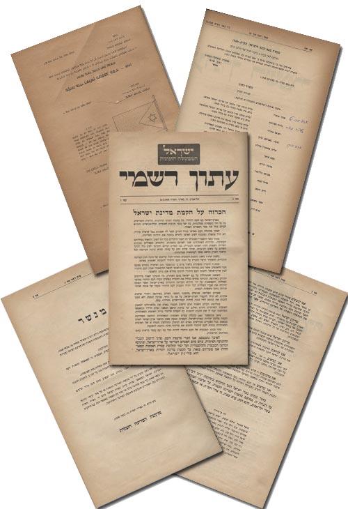 Very rare first published printing of the Israeli Declaration of Independence, entitled in full, ''Israeli Declaration of the Establishment of the State of Israel.'' Declaration is printed in the ''Official Gazette'' of the Provisional Government of Israel and reads in part, ''The Land of Israel was the birthplace of the Jewish people. Accordingly we, members of the People's Council, representatives of the Jewish community of Eretz-Israel and of the Zionist Movement, are here assembled on the day of the termination of the British Mandate over Eretz-Israel and, by virtue of our natural and historic right and on the strength of the resolution of the United Nations General Assembly, hereby declare the establishment of a Jewish state in Eretz-Israel, to be known as the State of Israel.'' Lot also includes 24 other issues of the ''Official Gazette'' from 14 May to 1 October 1948, bound in blue cloth boards measuring 8'' x 12.5'', with 168 numbered pages in total. Unidentified ink writing on cover, and underlining and minor handwriting on inside pages. Some issues have more toning than others and a few pages have slight tears at the edges, with horizontal tears on two sheets of the 21 May issue. Overall very good condition.