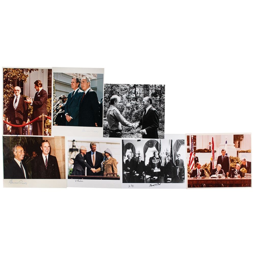 Interesting group of seven photos of Israeli leaders with American presidents from Ford to Clinton, 8 x 10 and 10 x 8, signed in various inks by one or more of the subjects. Signers are: Menachem Begin and Gerald Ford; Menachem Begin (3); Shimon Peres (2); and Yitzhak Rabin. In very good to fine condition, with surface impressions to the Ford/Begin photo from the collector writing on an item on top.