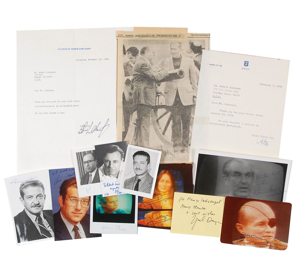 Collection of 14 items, primarily consisting of signed photos and signatures, each signed by a prominent Israeli leader. Signers are: Menachem Begin (TLS, signature, and two SPs), Yael Dayan (ANS and two SPs), Moshe Dayan (SP), Chaim Herzog (SP), Teddy Kollek (SP), Ehud Olmert (SP), Shimon Peres (SP), and Ezra Weizman (two SPs). In overall very good to fine condition. Accompanied by many of the original mailing envelopes and transmittal letters.
