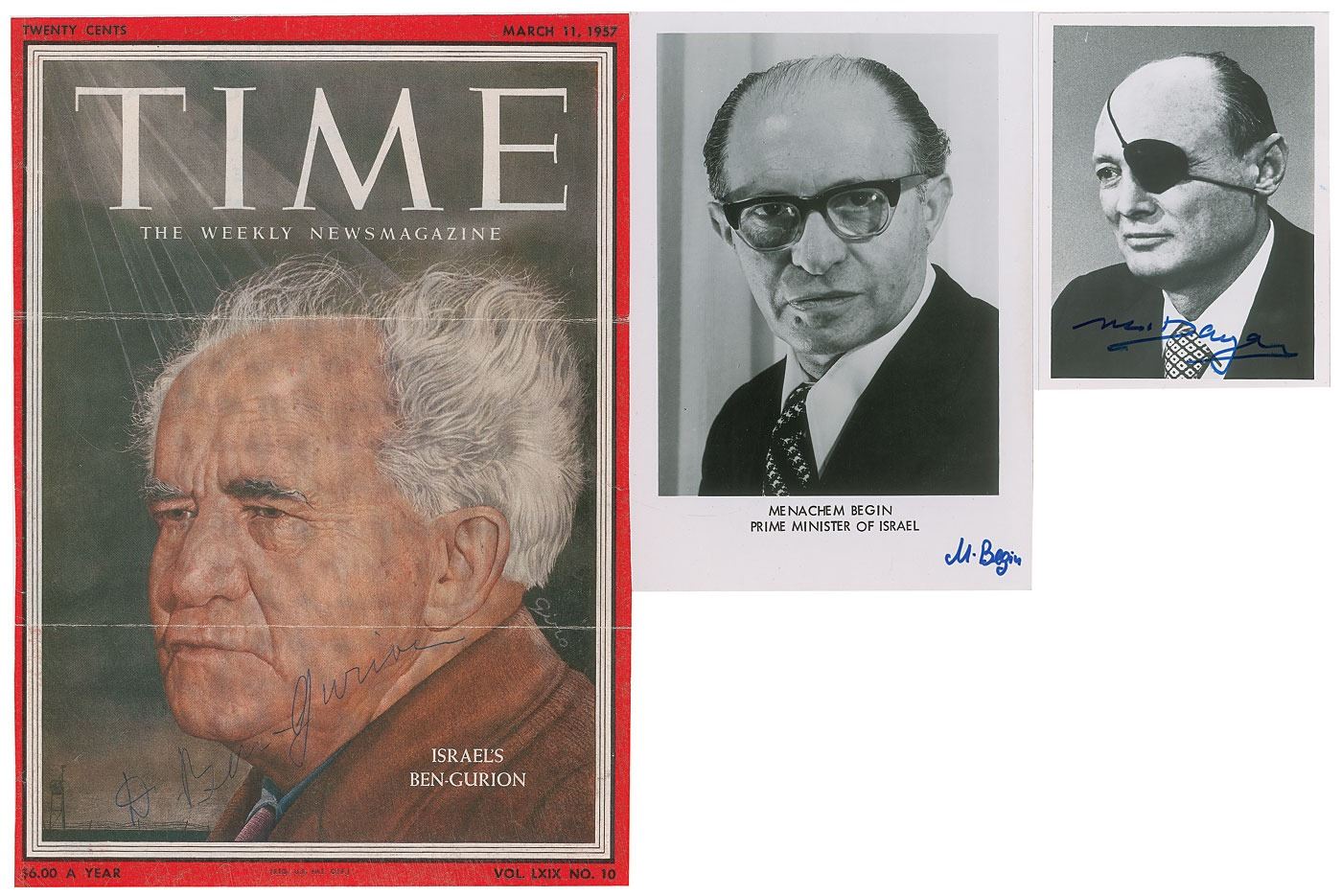 Three items signed in blue ballpoint or felt tip by a notable Israeli political or military leader, including: Menachem Begin (glossy 5 x 7.25 photo), Moshe Dayan (glossy 3.5 x 4.75 photo), and David Ben-Gurion (Time magazine cover). In overall very good to fine condition, with trimmed edges and mailing folds to the Ben-Gurion cover.