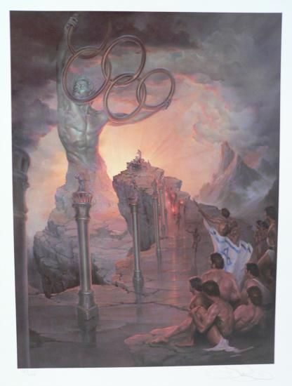 Born in 1942 and educated in the fine arts at the prestigious Art Students League in New York City, John Pitre evolved to become a master of fantasy and surrealism. Pitre has been a significant influence in the art world for over thirty years, and carries the distinction of being one of the most widely published artists in modern history. As a storyteller, Pitre uses his paintbrush to comment on the most profound questions concerning man, and to create a reflection of our times and the world in which we live. He creates entire imaginary worlds completely from his mind, using artistic expression as a vehicle for powerful social commentary. Well before they became the significant social issues of our times, Pitre's surrealistic renditions of the threat of overpopulation, the ominous shadow of nuclear war, and the ecological deterioration of our planet became widely popular as poster images, selling in the millions. One image alone, "Restrictions", sold an estimated seven million copies. Through his art Pitre continues to bring to our attention important aspects of our human condition, and as a result of his visionary talents, his social commentary paintings are now considered twentieth-century classics. A modern day DaVinci, Pitre holds numerous patents to his name. He is a pioneer in many fields; he explored the depths of the oceans with diving gear he designed himself, long before commercial dive equipment was available. His affinity for the high seas led to designs for generating electricity from ocean waves and currents. Pitre is also an accomplished pilot who has learned to fly every form of aircraft available to him, including a unique, one of a kind configuration that he personally conceived of, engineered, and built. Still an adventuring aviator; he now owns and flies his own helicopter. Based on his meticulous study of human anatomy in the arts, Pitre has designed some of the world's most advanced fitness equipment, that can be seen today in many of the world's finest gyms. His credits in this field include the Questar line of fitness equipment and the ROM (Range of Motion) machine, which was awarded the "Best of What's New" designation in 1993 by Popular Science Magazine; and the Time Works device that led to one of TV's most successful infomercials. He also developed and patented a new proprietary formulation for artist's paint based on space age polymers, that is now sold worldwide. (Genesis Paint) Look beyond the surface, and into the depths of paintings by John Pitre, and you will look into the mind and soul of one of mankind's great thinkers. Through his social commentary art and visionary paintings he shares his vision of our purpose in the universe, and reminds us of the responsibilities we have as moral beings and as stewards of our planet. He tells about life as a human citizen here on Earth, warning about its difficulties and pitfalls, but also portrays the beauty and magic that each one of us possesses within. He encourages us to follow our longings and aspirations to achieve our dreams, but to hold dear the relationships we have with all other men. Pitre's work is transcendental in nature and many people derive their own profound yet private meaning from his paintings. When describing Pitre's work, most people speak not of its appearance, amazing as it is, but rather of their own personal moment of epiphany inspired by the paintings of this master.